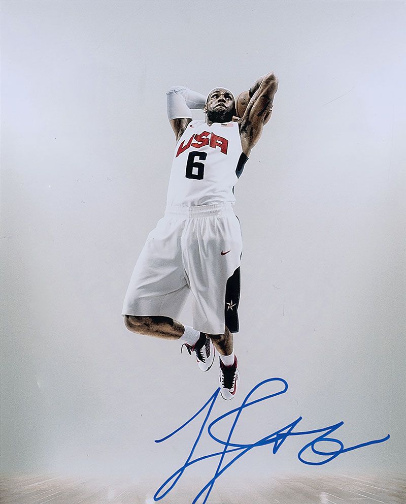 Color satin-finish 8 x 10 photo of James dunking for the US basketball team, signed in blue felt tip. In very fine condition.