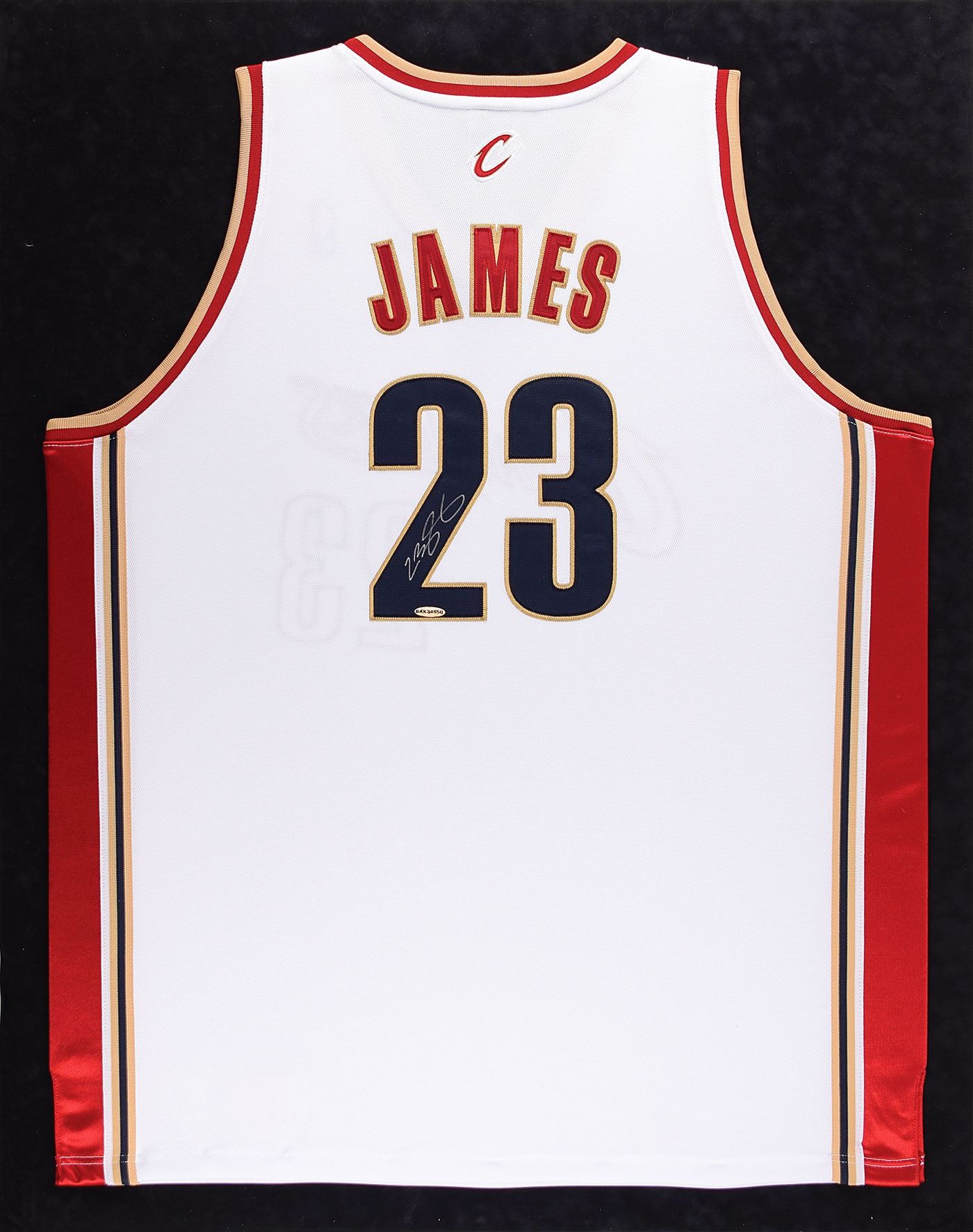 Desirable replica Cleveland Cavaliers basketball jersey, with sewn on letters and numbers, signed in silver ink on the number on the back by Lebron James. Mounted to a 32 x 40 piece of suede matboard. In fine condition, with an Upper Deck authentication hologram affixed to the number.
