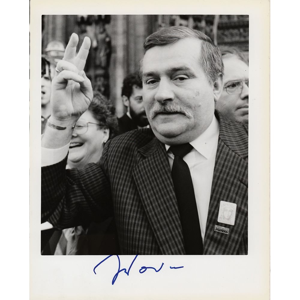 The second president of Poland (born 1943) and the first to be democratically elected; he helped end communism in Europe as the leader of the freedom-oriented Solidarity trade union, actions that led to his awarding of the 1983 Nobel Peace Prize. Glossy 8 x 10 close-up photo of Lech Walesa with his hand raised outdoors, signed in the lower border in blue felt tip. In fine condition. Originally obtained by in-person specialist Mike Wehrmann.