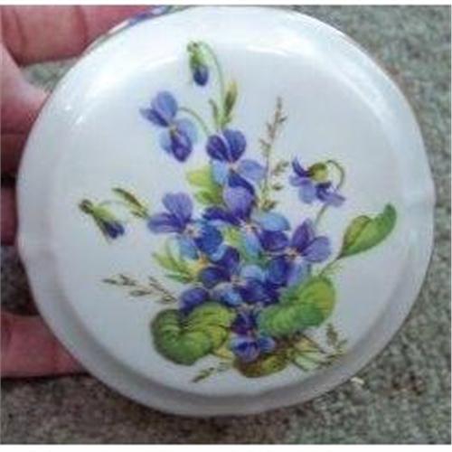 This pretty little trinket box is from Leclair or LEC Leclair, a Limoges porcelain manufacturer active from 1945 to the late 1900s. Their range of items included dinnerware and decorative items.<p>The trinket box is decorated with handpainted deep purple violets and green leaves. It measures 3.75 inches in diameter, and stands 2 inches high. It is in excellent undamaged condition; it appears virtually untouched.