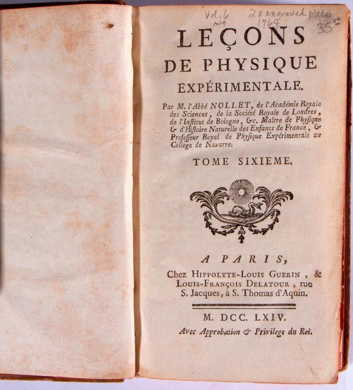 Title: Lecons de Physique Experimentale Author: M. l'Abbe Nollet Published: Chez Hyppolyte-Louis Guerin, Paris, 1764 Description: Hardcover. Volume 6. Leather bound. French edition. Condition: Fair condition. Leather binding if rubbed and chipped in areas, and head is separating at joint.