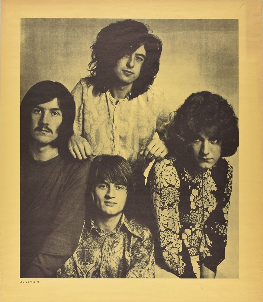 Scarce yellow-tinted 22 x 25.25 promotional poster for the release of Led Zeppelin's self-titled debut album, depicting the young band in a close group shot, with lone text to lower left border: "Led Zeppelin." Rolled and in fine condition.