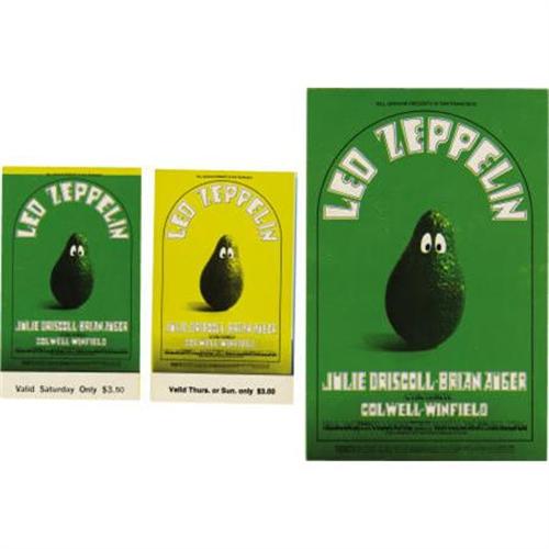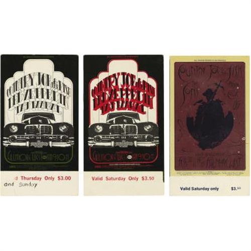 <B>Led Zeppelin/Country Joe and the Fish Ticket and Postcard Group (Bill Graham, 1969-70). </B></I> Includes the following unused tickets: BG-155 Led Zeppelin and Country Joe (Thursday, 1/9/69 and Saturday, 1/10.69); BG-170 Led Zeppelin and Julie Driscoll (Thursday, 4/24/69 and Saturday, 4/26/69); and BG-217 Country Joe and the Sons (Saturday, 2/14/70). The postcard to BG-170 is also included in this lot. All items average VG+ condition.<BR><BR><b>Shipping:</b> Flat Material, Small (<a target="_blank" href="http://www.heritageauctions.com/common/shipping.php">view shipping information</a>)