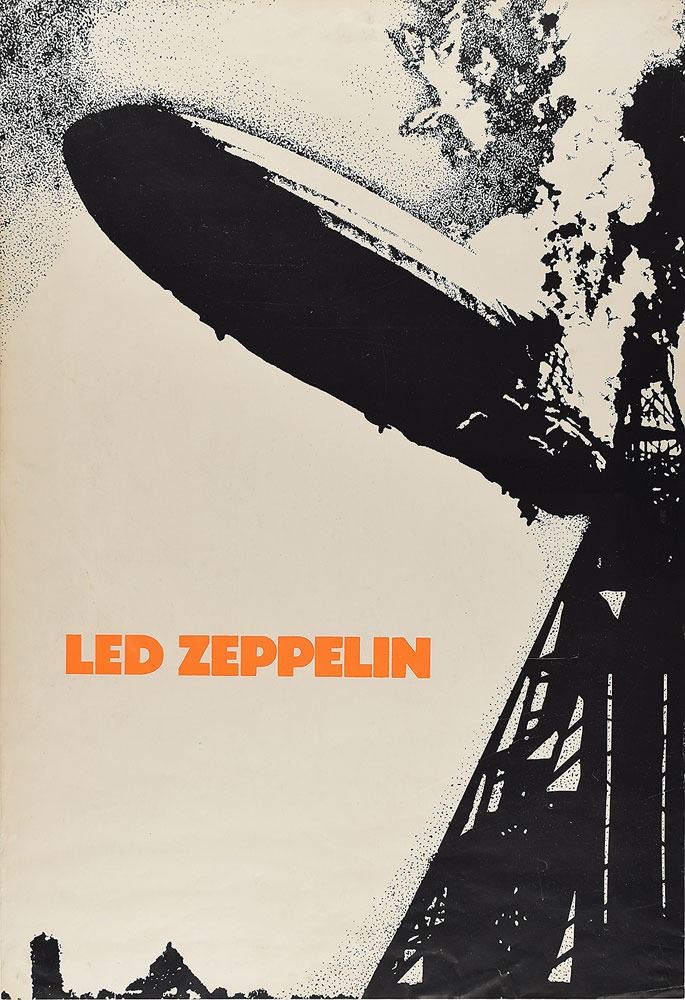 Appealing color 19 x 27.75 poster showing George Hardie's iconic 'Hindenburg disaster' design for the front cover of Led Zeppelin's self-titled debut album, with the band's name in bold orange lettering. Rolled and in very good condition, with some light rubbing and scattered light creasing.