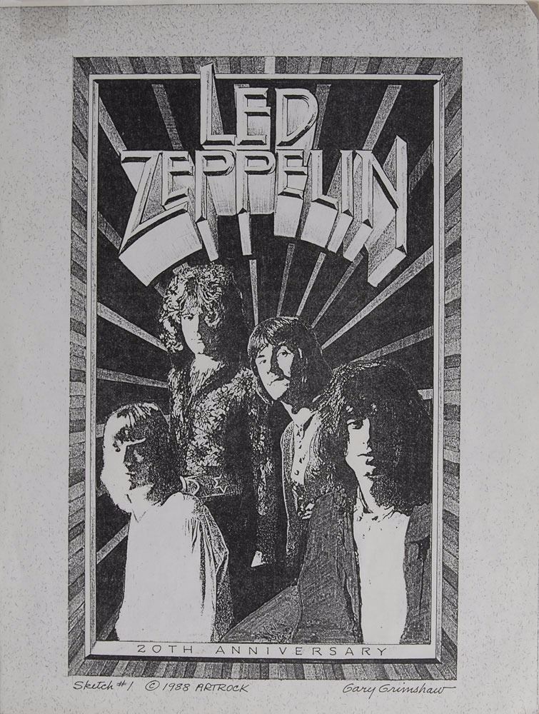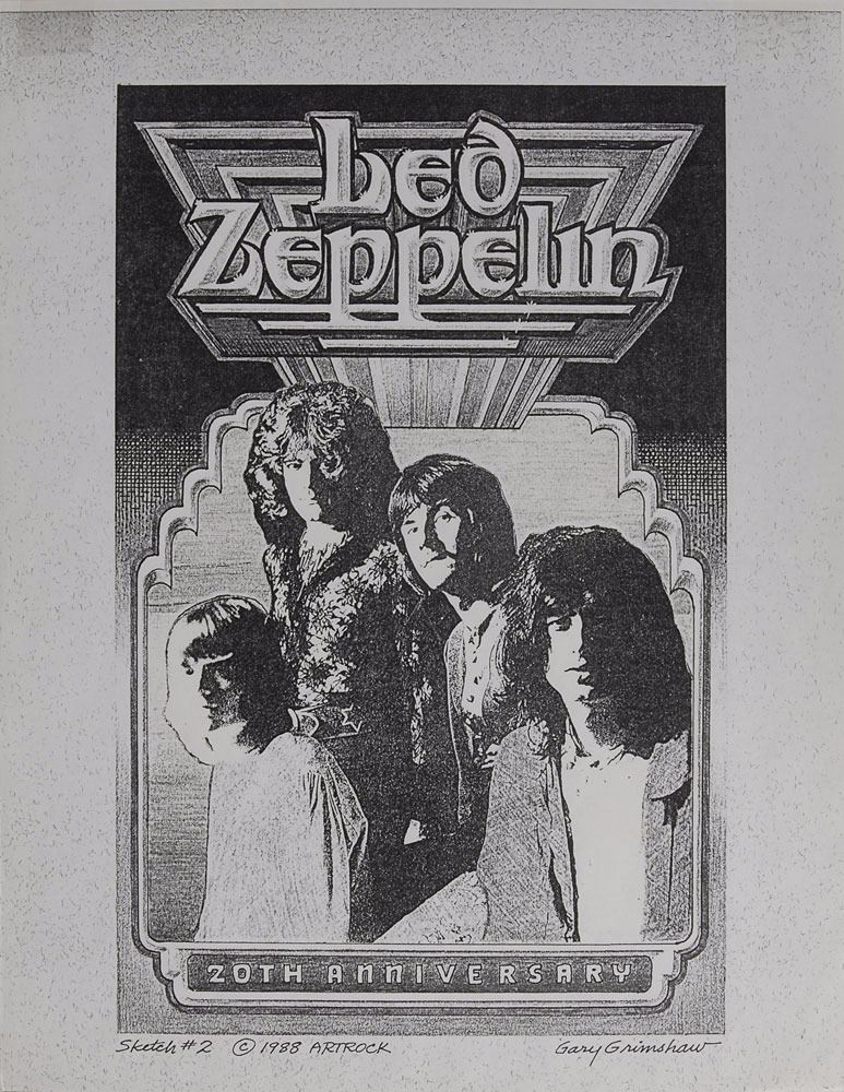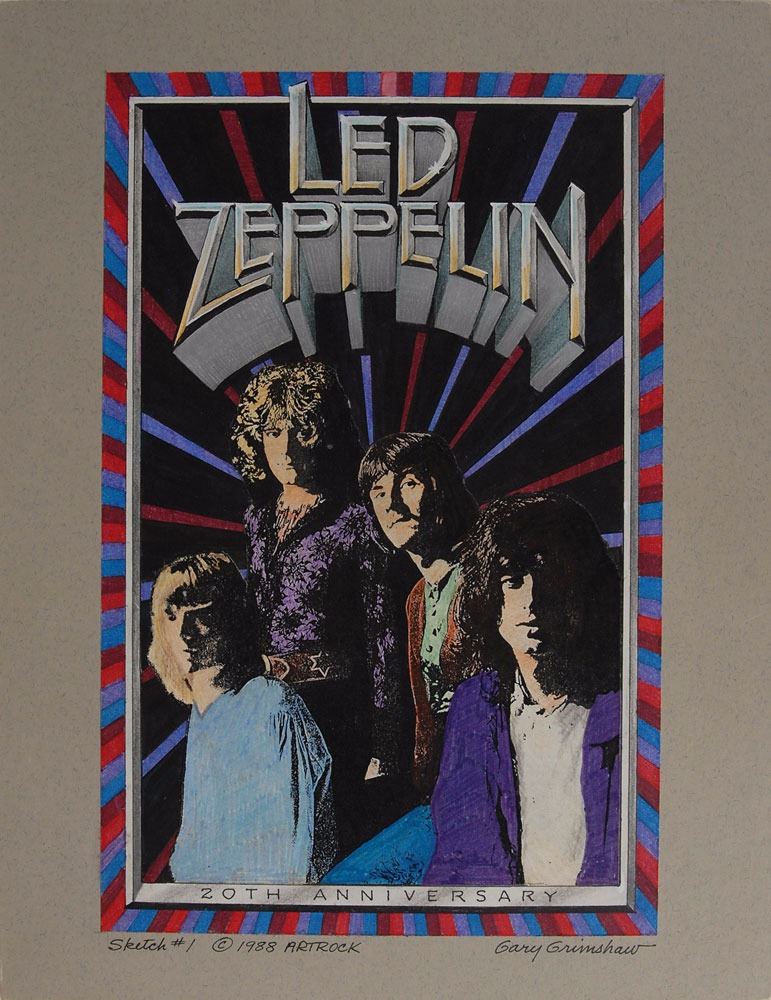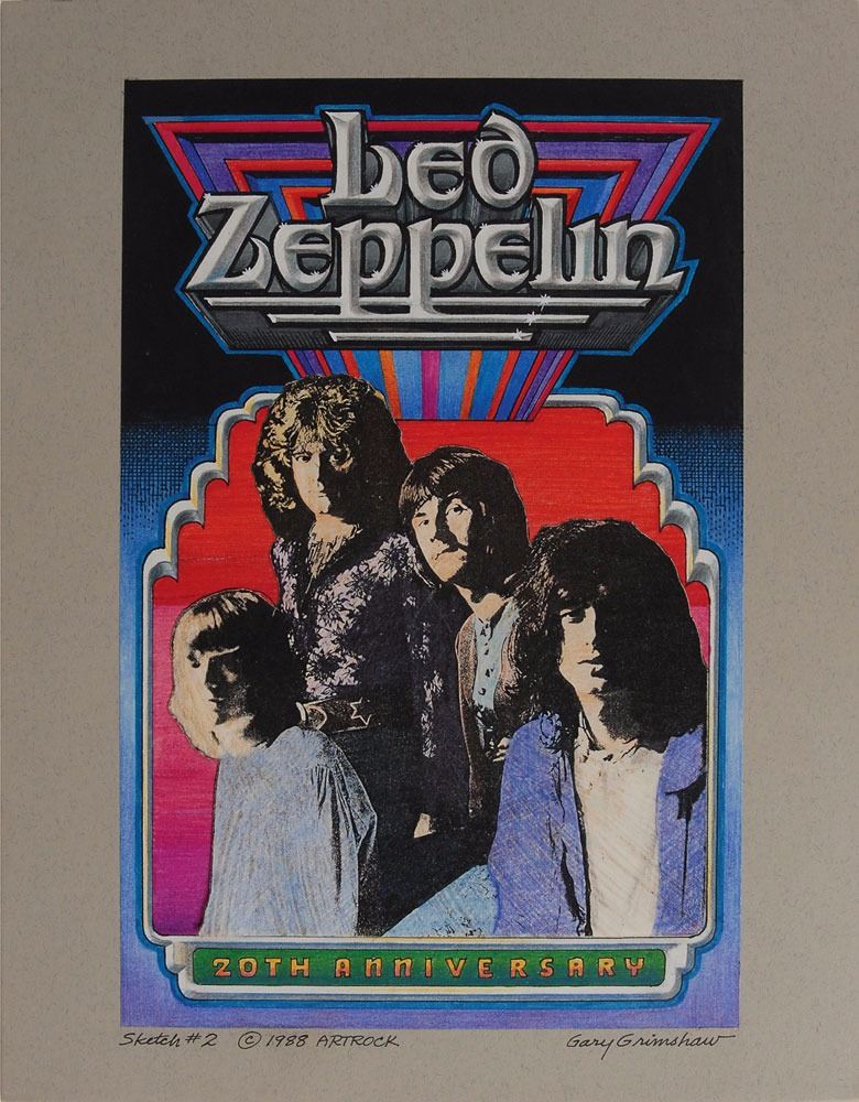 One-of-a-kind original pair of hand-colored preliminary designs for a Led Zeppelin 20th Anniversary poster by psychedelic artist Gary Grimshaw, both 6 x 9.25, individually affixed to slightly larger mats, signed on the mats in black ink, “1988 ArtRock, Gary Grimshaw,” adding “Sketch #1” and “Sketch #2” to the respective work. Accomplished with a mixture of ink, paint, and colored pencil and marker around affixed cutout images of the band, with differing “Led Zeppelin” logos, “20th Anniversary” text, and background designs; both pieces share a noticeably purple and magenta color pattern. In overall fine condition. Influenced by Stanley Mouse, Rick Griffin, and Victor Moscoso, Grimshaw has earned his own place within the rock and roll art scene by producing eclectic posters for bands like Cream, The Who, and the Jimi Hendrix Experience. A band's approval must be obtained before printing a poster using their name and likeness; these preliminary mock-ups were created for Led Zeppelin for this purpose. The final “20th Anniversary” poster featured the background from the first sketch and the logo from the second, with a Zeppelin airship added behind the logo.