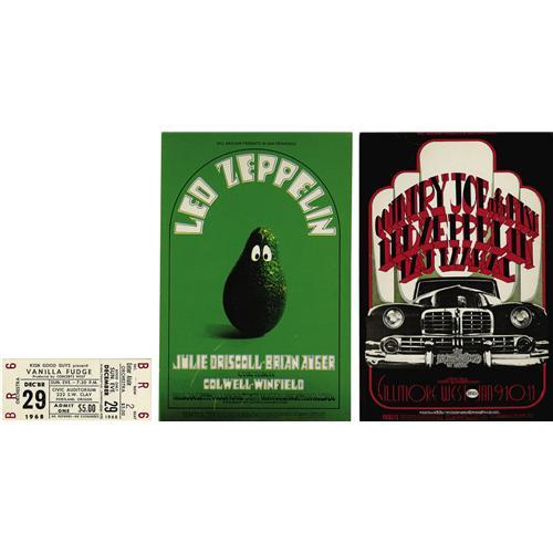 <B>Led Zeppelin - Group of 3 (1968).</B></I> A groovy grouping from the band that was called the "Hammer of the Gods." In this group you will receive: a ticket from the Civic Auditorium in Portland, Or. (1968), a postcard from the Fillmore West (BG-155, 1969), and a postcard from Winterland (BG-170, 1969). All three items are in NM- condition.