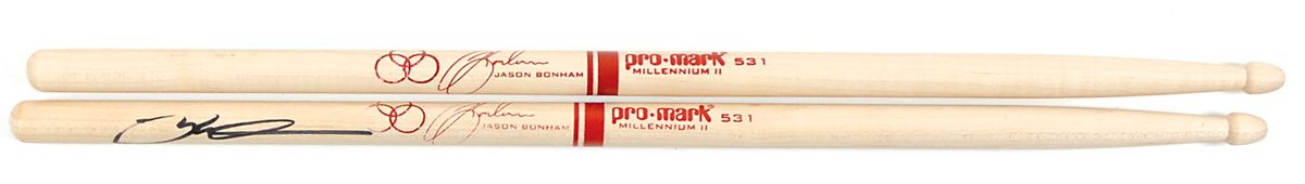 Unused set of Pro-Mark Jason Bonham model wooden drumsticks, one signed in black felt tip. In fine condition.