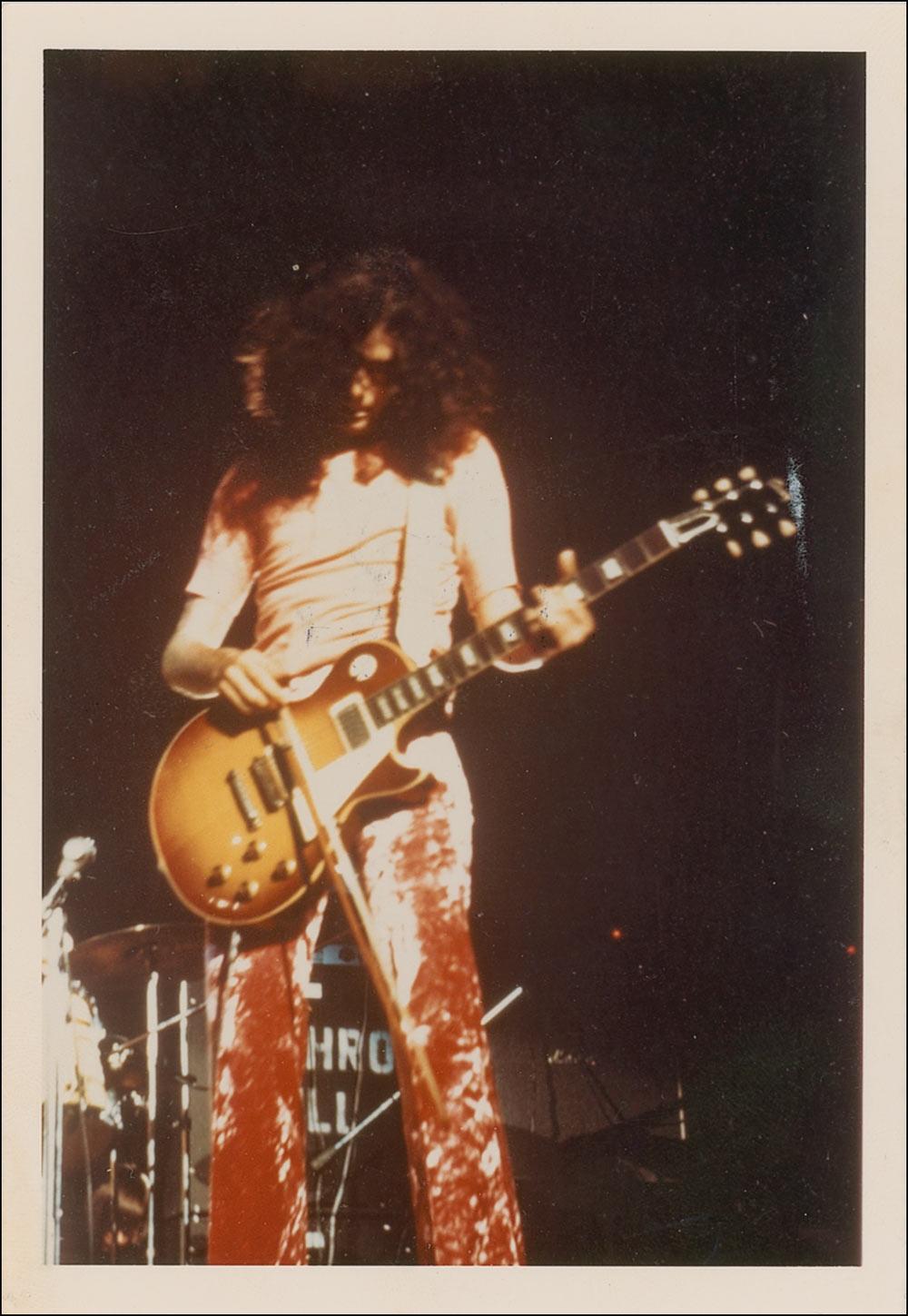 Vintage color glossy 3.5 x 5 candid photo of Page playing his guitar on stage with a violin bow, signed on the back in black felt tip, “Best wishes, Jimmy Page.” In fine condition, with a couple small brushes to signature. Stamped on verso Kodak Oct 1969, this image is from Led Zeppelin's first tour in North America with Jethro Tull. Consignor notes that this vintage piece came from the Sue Lydon estate (photographer and editor) who along with Jan Wenner were founders of Rolling Stone Magazine.