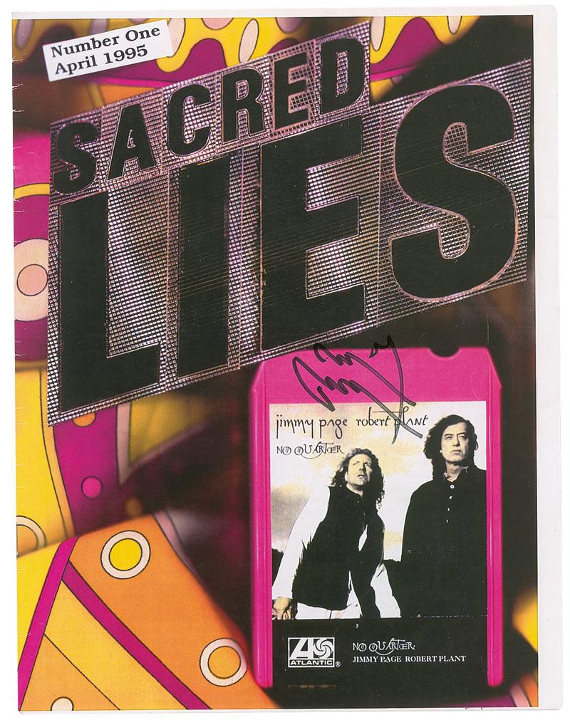 Sacred Lies magazine, dated April 1995, 8.5 x 11, all about the Page and Plant reunion in 1995, signed on the front cover in black felt tip by Page. In fine condition, with some light cover creasing and expected handling wear.
