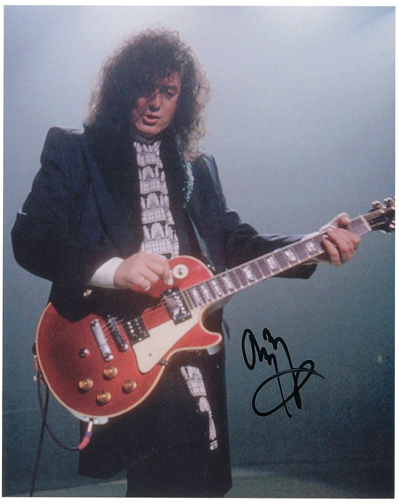 Color satin-finish 8 x 10 photo of Page with his guitar, signed in black felt tip. In fine condition.