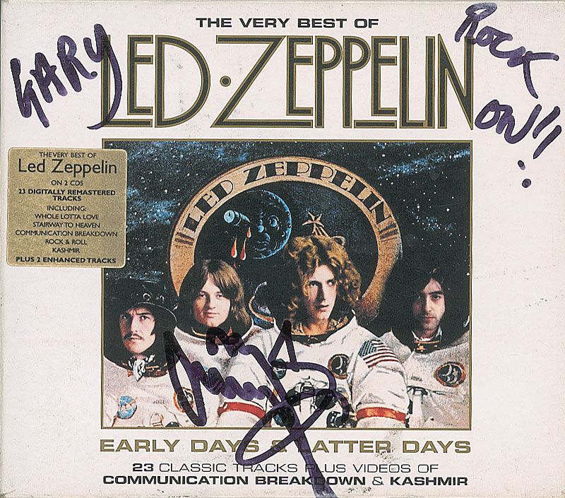 The Very Best of Led Zeppelin CD signed and inscribed on the front of the box, “Gary, Rock On!! Jimmy Page.” In fine condition, with a bit of light wear to box. The CD is included.