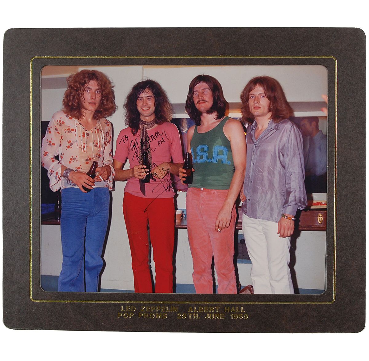 Color satin-finish 9.25 x 7.5 photo of Led Zeppelin at the ‘Pop Proms,’ Royal Albert Hall, on June 29, 1969, signed and inscribed later in black felt tip, “To Graham, Rock On! Jimmy Page.” Housed in a 12 x 10 presentation mat. In fine condition. Accompanied by a certificate of authenticity from Tracks.
