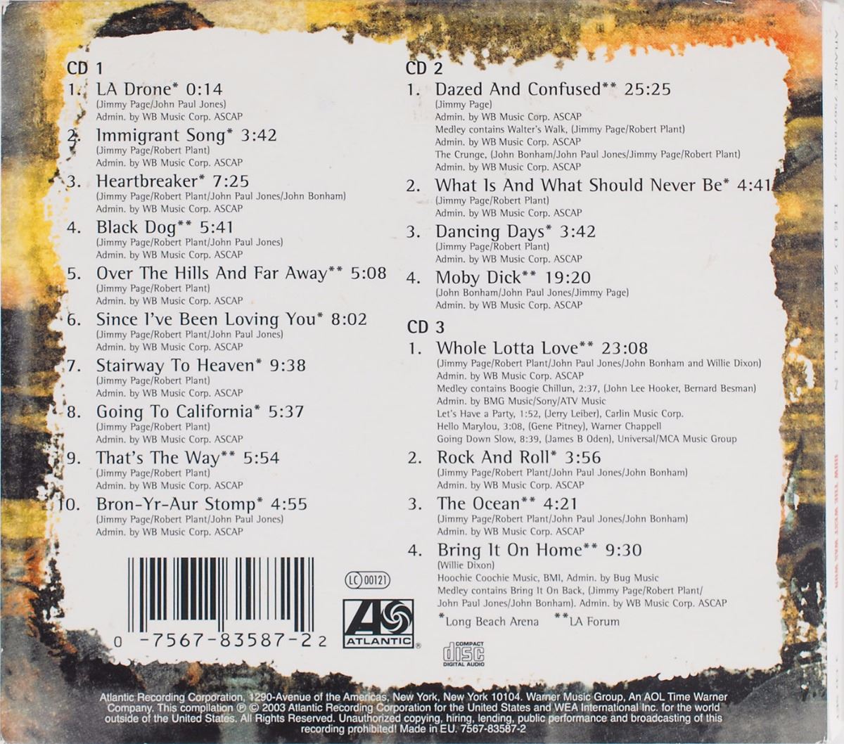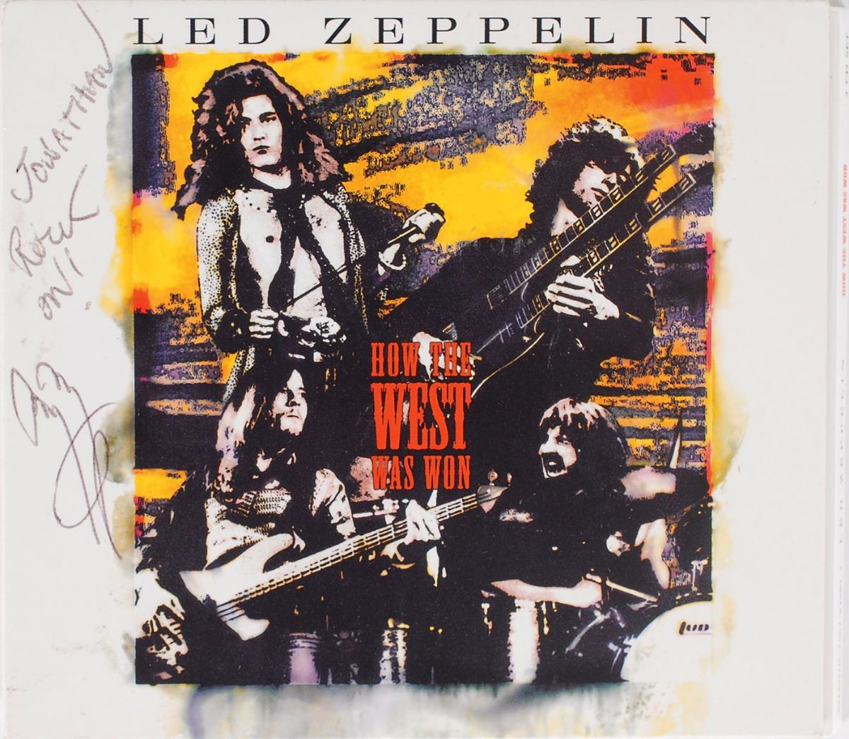 How the West Was Won CD signed and inscribed on the front in black ballpoint, “Jonathan, Rock on! Jimmy Page.” In fine condition, with surface impressions to Plant’s image. The CDs are included.