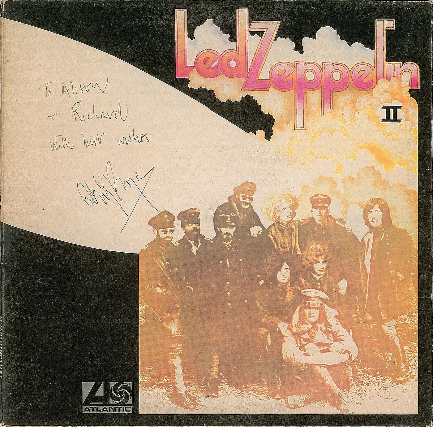 Led Zeppelin II album signed and inscribed on the front cover in black ballpoint, "To Alison & Richard, with best wishes, Jimmy Page." In fine condition, with expected light wear. The record is included. A sought-after title signed by the album's producer and principal songwriter.