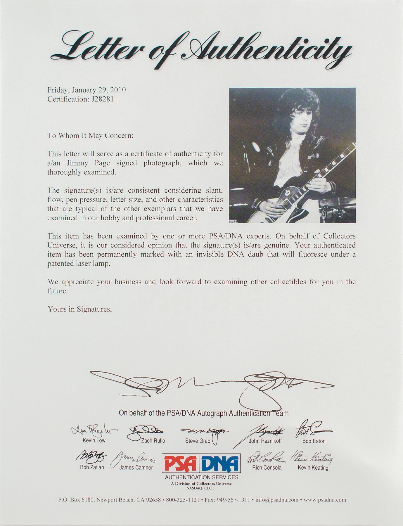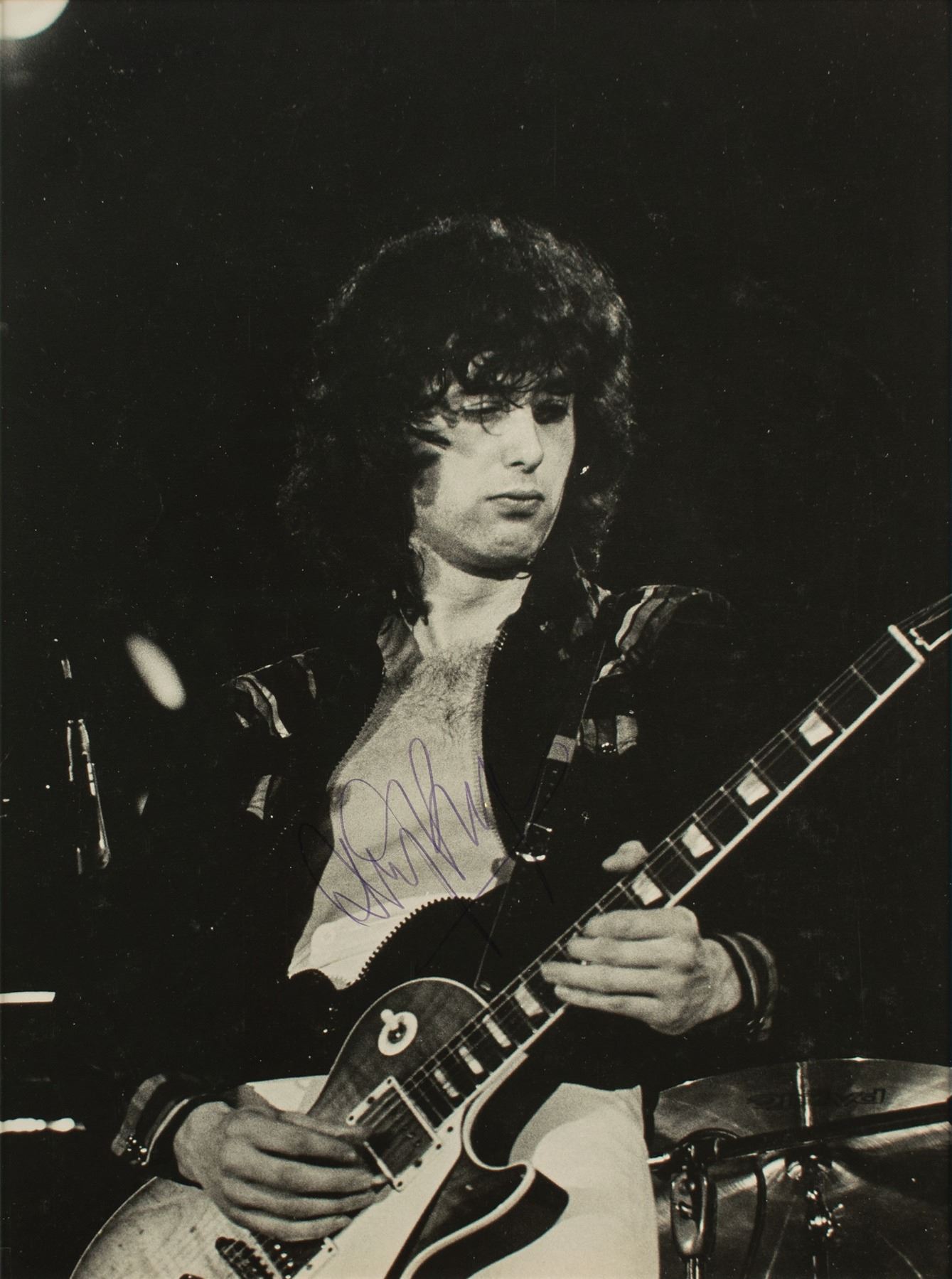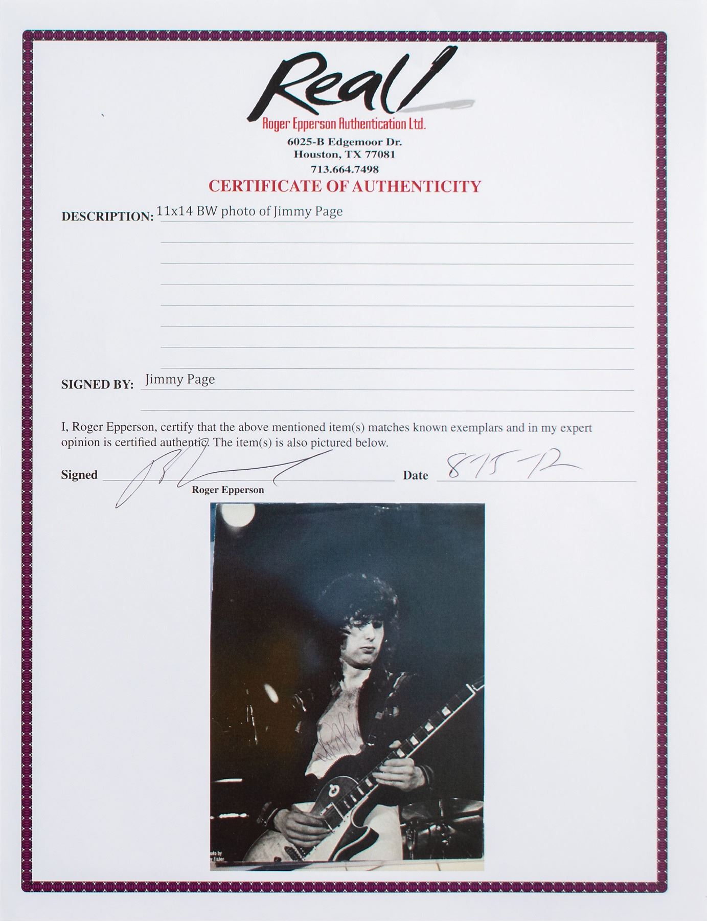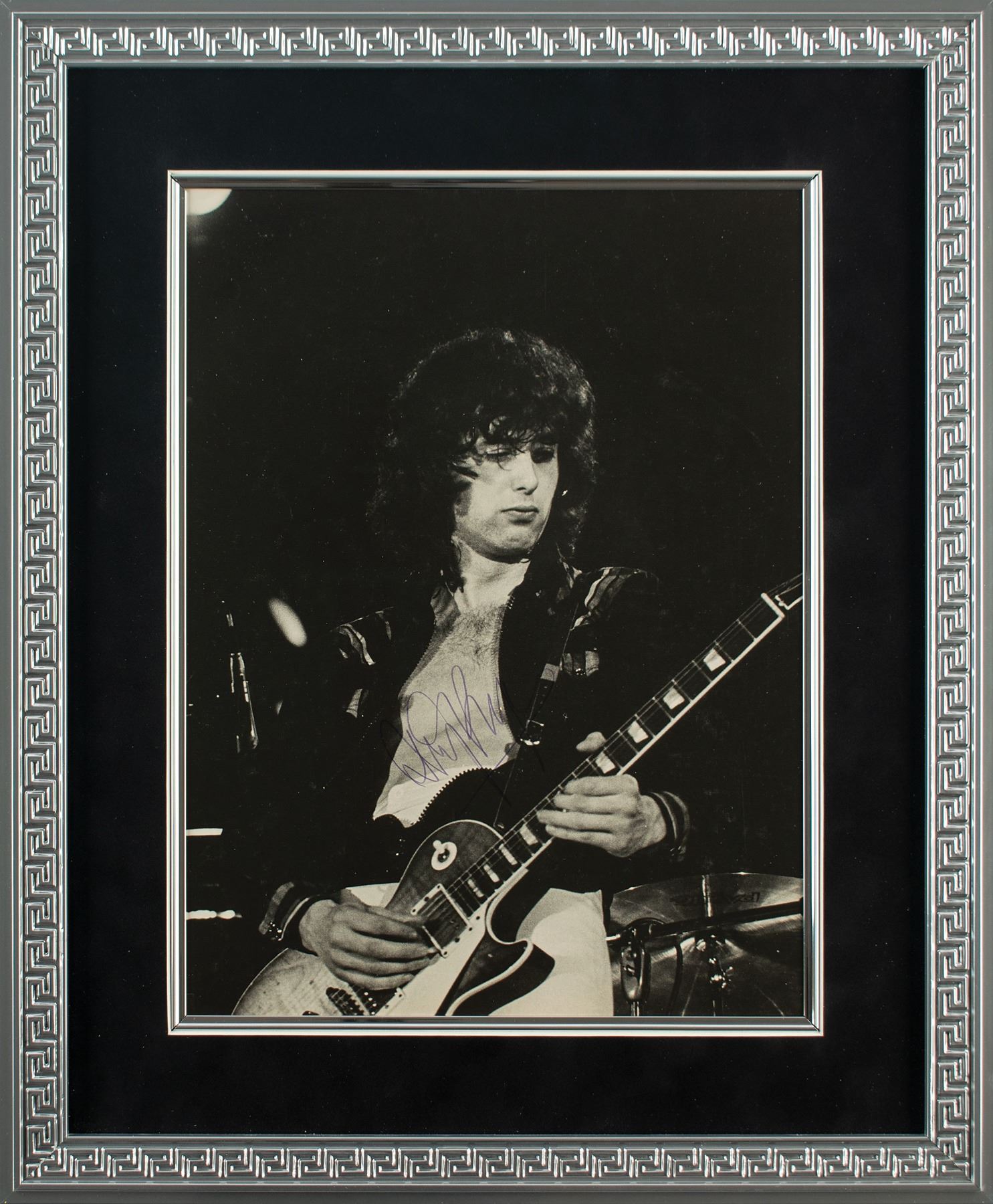 Semi-glossy 10 x 13.25 silver gelatin photo of the Led Zeppelin guitarist during a live performance, signed in black felt tip by Jimmy Page. Suede-matted and framed to an overall size of 16 x 19.5. In fine condition, with scattered light creasing, and a light vertical scratch. Accompanied by full letters of authenticity from REAL and PSA/DNA. Consignor notes that this autograph was obtained in person in 1976.