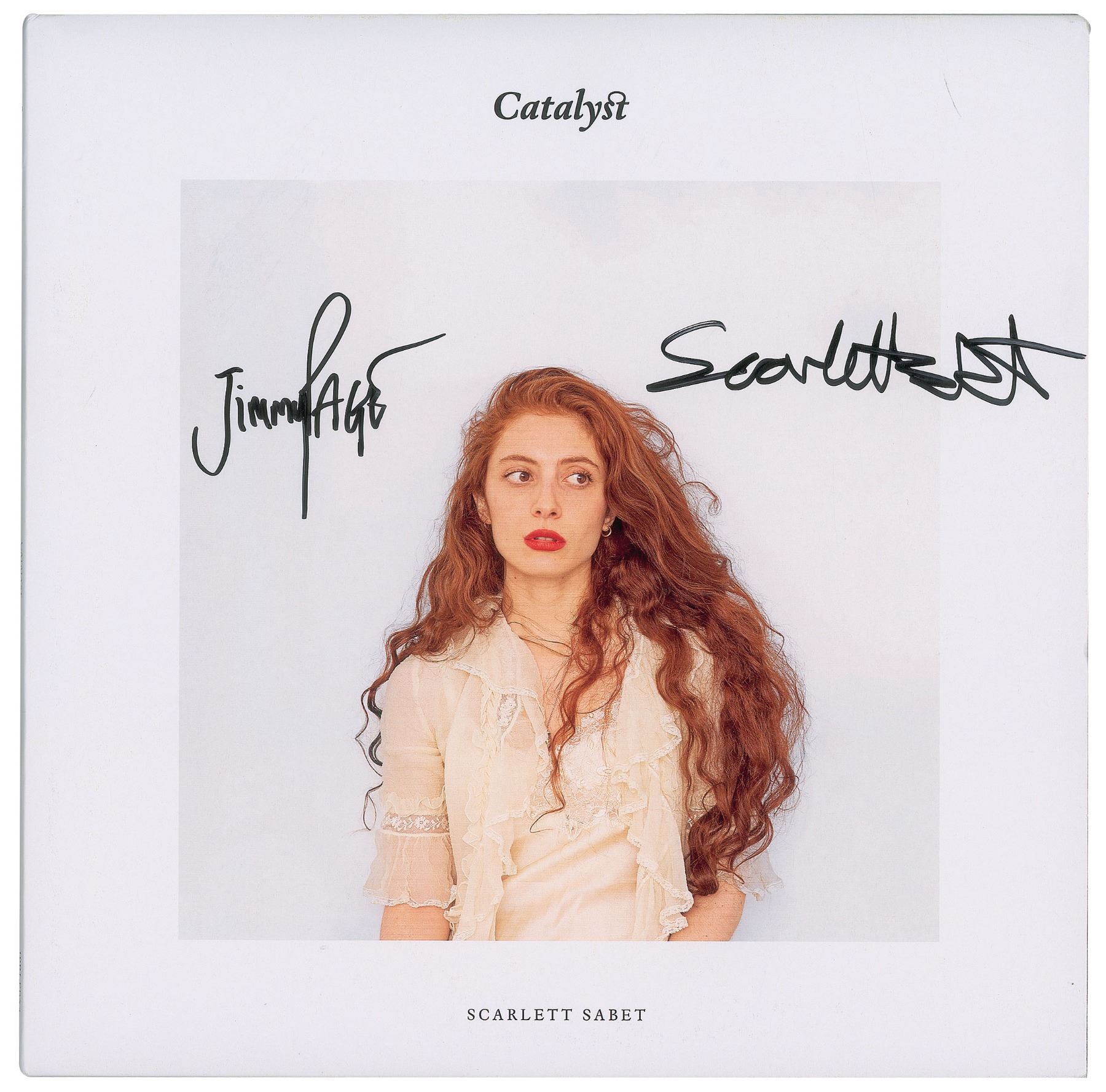 Limited edition Catalyst album by Scarlett Sabet, numbered 137/156, signed boldly on the front cover in black felt tip by Jimmy Page and Scarlett Sabet. In very fine condition. The record is included. Catalyst is a spoken word album written and performed by Sabet and produced by Page, who explains the project: 'I knew Scarlett's poems were exceptionally vibrant in print and I had witnessed the power of her public readings. I thought it would be exciting to do a project together to emphasize the power of the spoken word in the context of poetry and present her work in a radical form.'