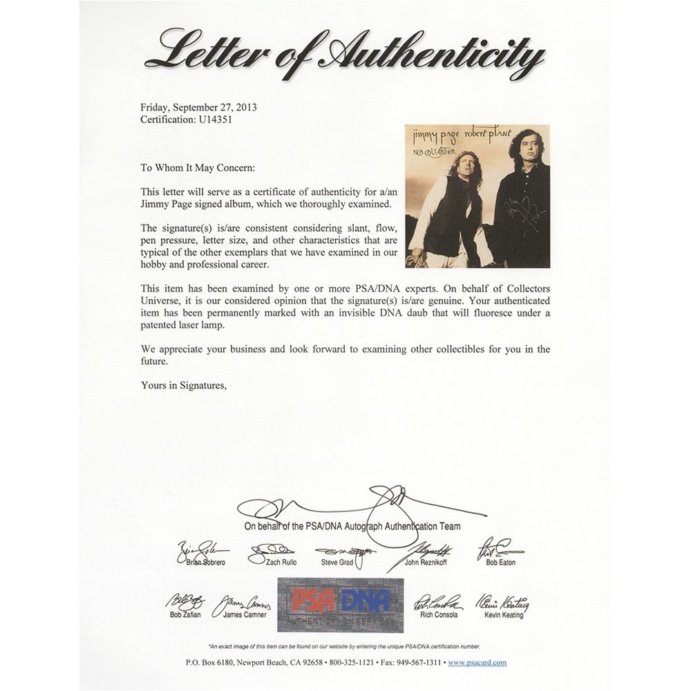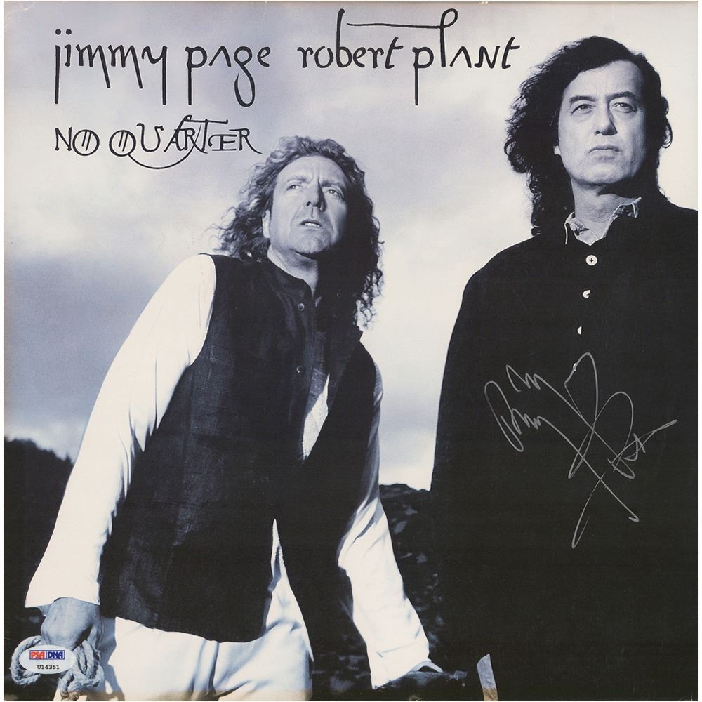No Quarter: Jimmy Page & Robert Plant Unledded album signed on the front cover in silver ink by Jimmy Page, and signed and inscribed on the back cover by Michael Lee, Charlie Jones, and Porl Thompson. In fine condition, with a crease to the upper left corner tip, and a PSA/DNA label affixed to the lower corner. Accompanied by a full letter of authenticity from PSA/DNA for Page's autograph. The record is included.
