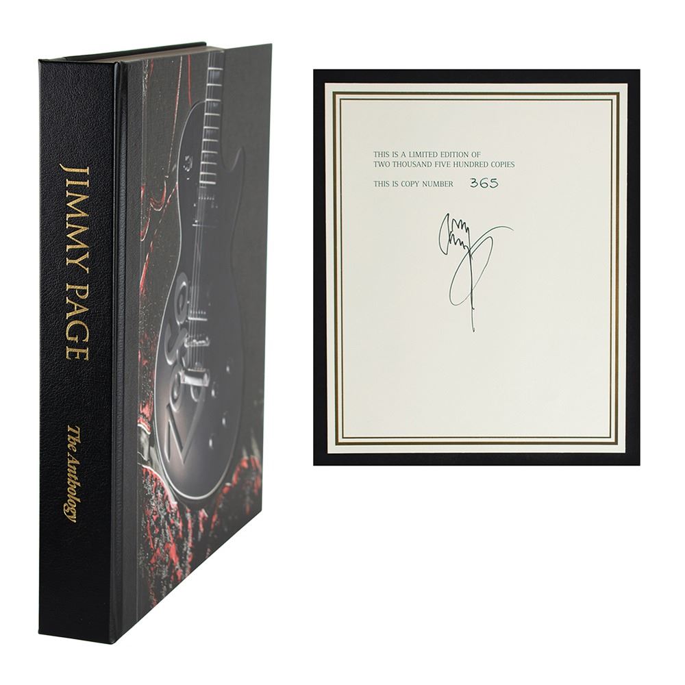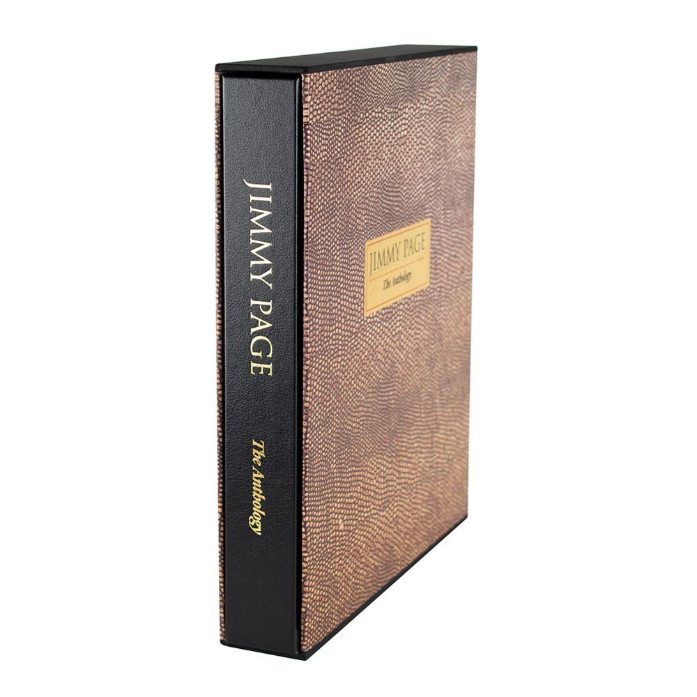 Signed book: Jimmy Page: The Anthology. Limited edition, numbered 365/2500. England: Genesis Publications, 2020. Hardcover quarter-bound in black leather, with gold leaf blocking and gilded page edging, 11.5 x 13.75, 399 pages. The book is presented in a lined archival slipcase inspired by the Selmer case of Jimmy Page's first electric guitar, his 1958 Resonet Futurama. Signed on the colophon in black ink by Page. Includes the original felt drawstring bag and Genesis box with matching edition number. In very fine condition. Following the sell-out success of his first book, this new limited edition book documents Page’s musical career through previously unpublished material from his rich personal archives. Jimmy Page: The Anthology is narrated entirely in his own words, and includes contextual photography spanning six decades.