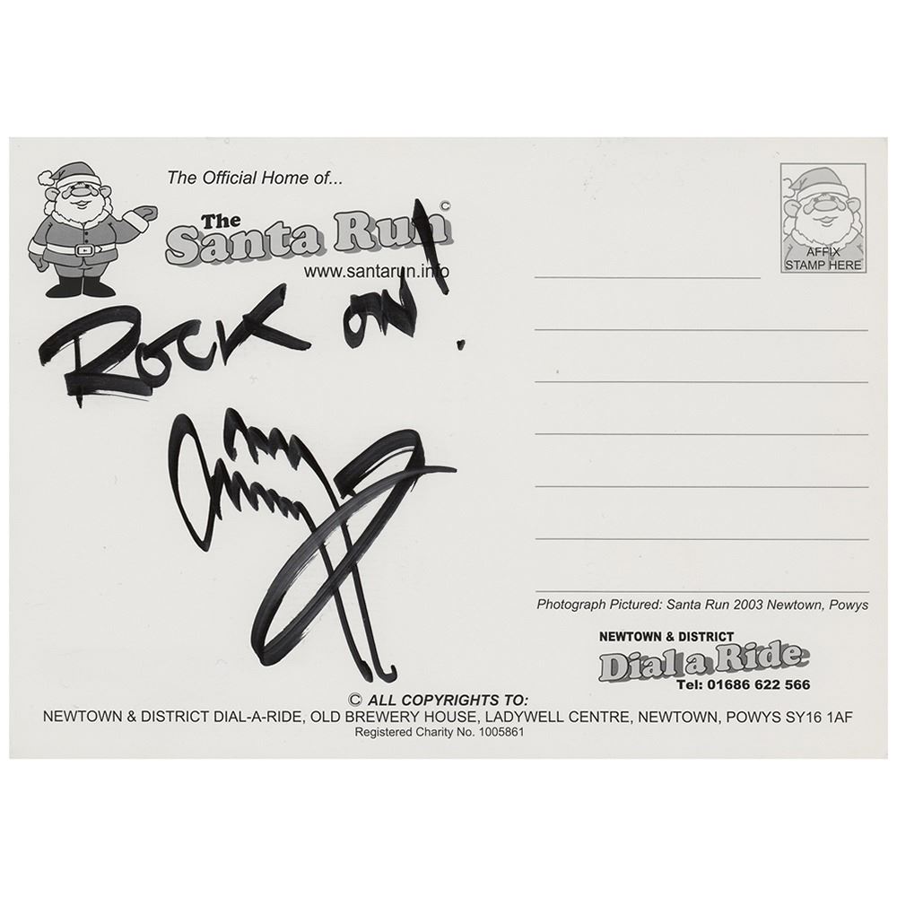 Felt tip signature, "Rock on! Jimmy Page,†on an oversized color 8.25 x 5.75 postcard promoting 'The Santa Run' of Newtown, Powys, Mid Wales. In fine condition. Accompanied by a certificate of authenticity from Tracks.