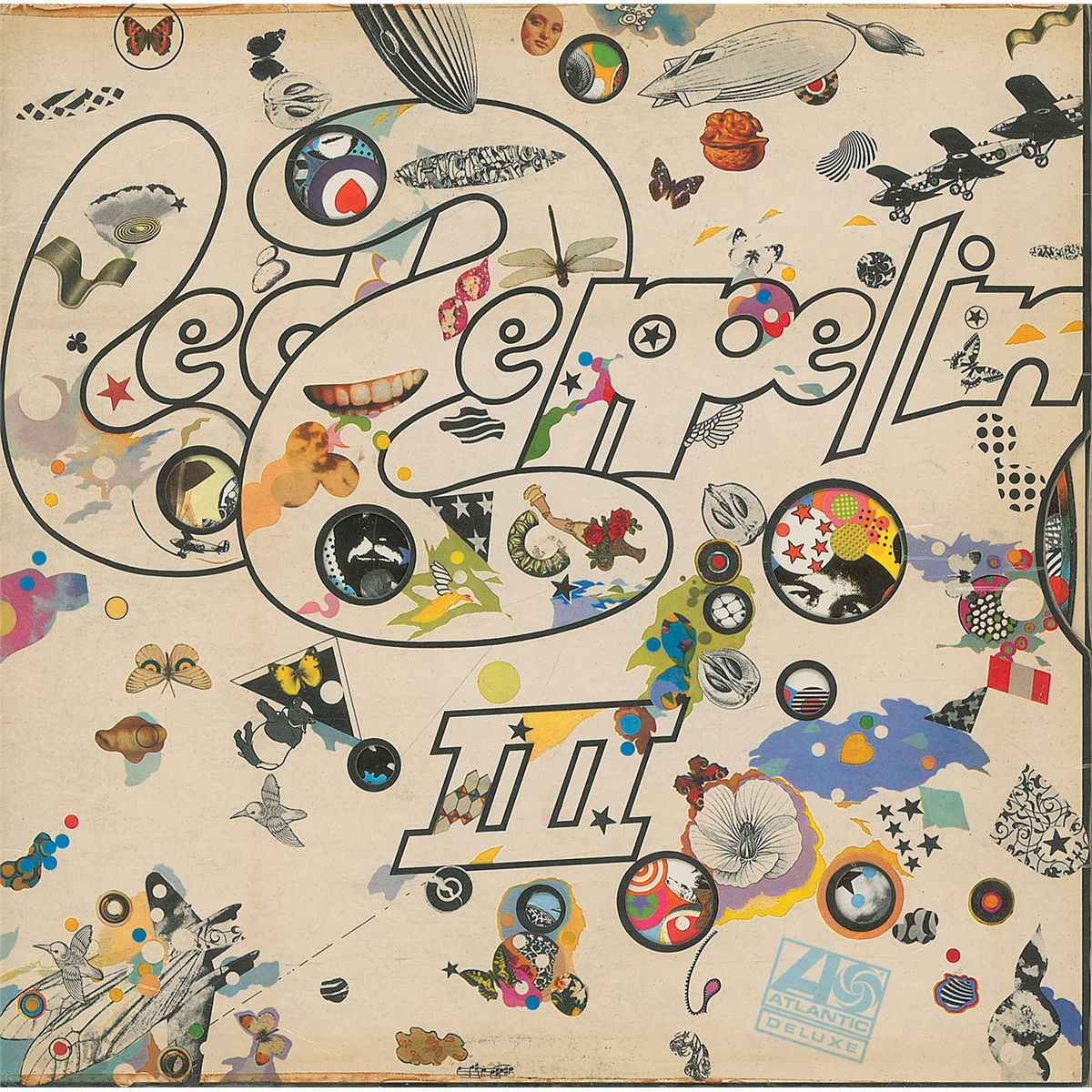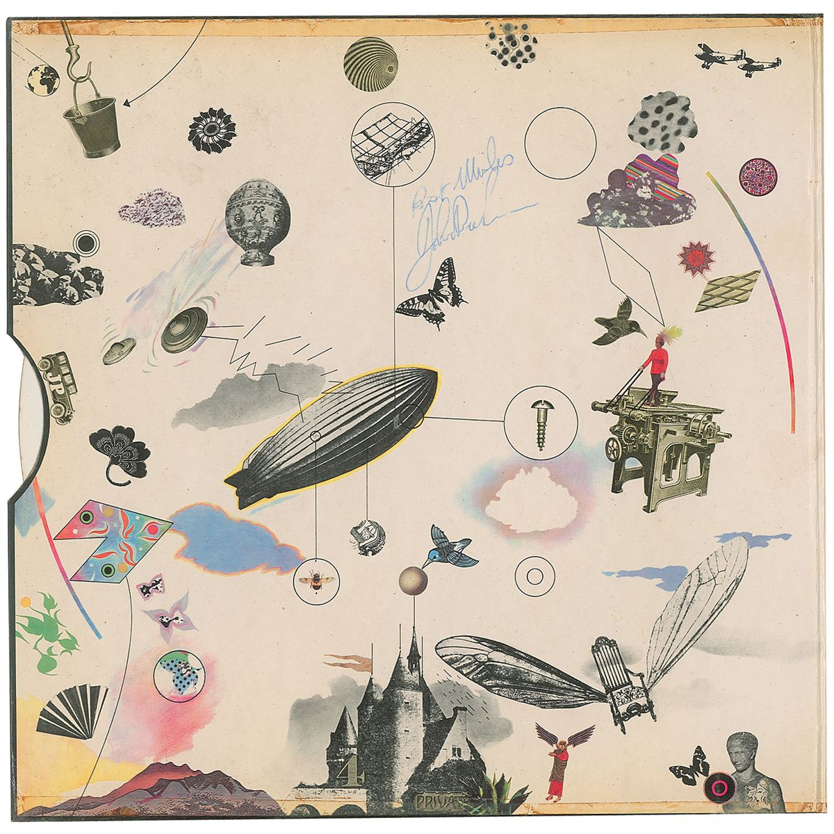 Rare first pressing of the Led Zeppelin III album signed on the inside of the gatefold in blue ballpoint, “Best wishes, John Bonham.” In fine condition, with old tape and toning to horizontal edges, a small separation along bottom edge of front cover, and a few light creases. The record is included. Released on the Atlantic ‘red/maroon’ label, the first pressing credited Peter Grant as Executive Producer, while subsequent pressings credited only Warner Bros. Music.