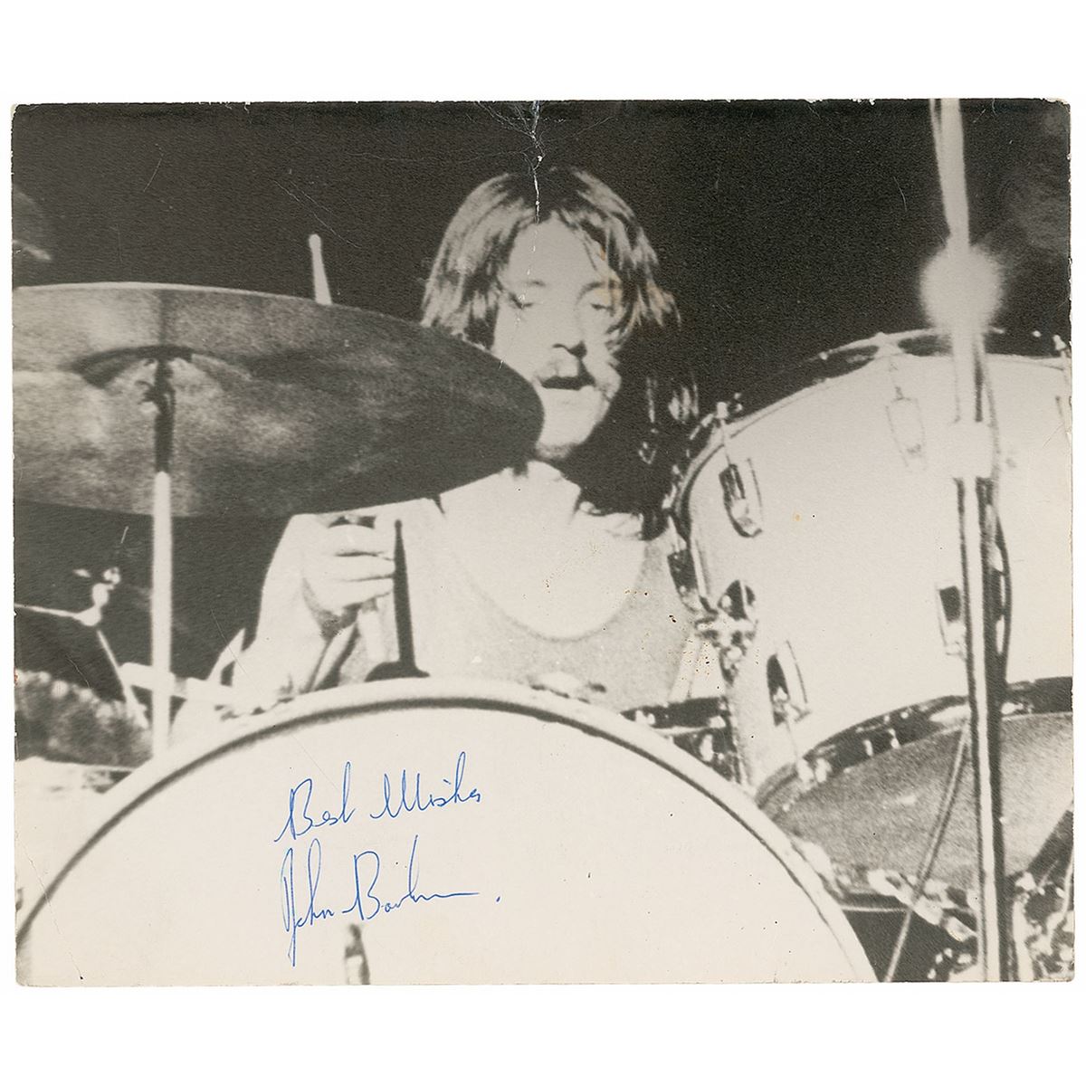 Rare vintage matte-finish 12 x 10 photo of Bonham at his drum kit, signed against the bright white background in blue ballpoint, “Best Wishes, John Bonham.” In very good condition, with a large tape-repaired tear extending from the top edge through the left side of his face, moderate scattered creases, and a couple trivial moisture spots to the first letter of his signature. Accompanied by a certificate of authenticity from Tracks.
