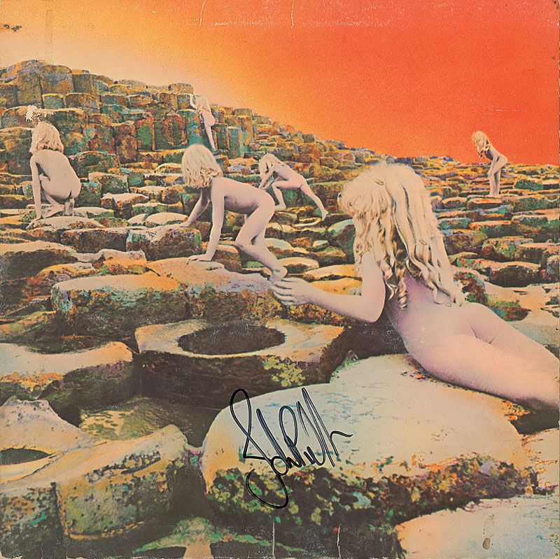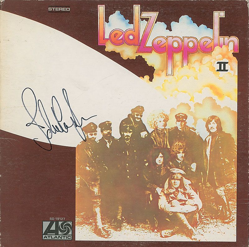 Two Led Zeppelin albums, Led Zeppelin II and Houses of the Holy, each signed on the front cover in black felt tip. One of the records is included. In fine condition, with scattered creases and surface marks to both covers.