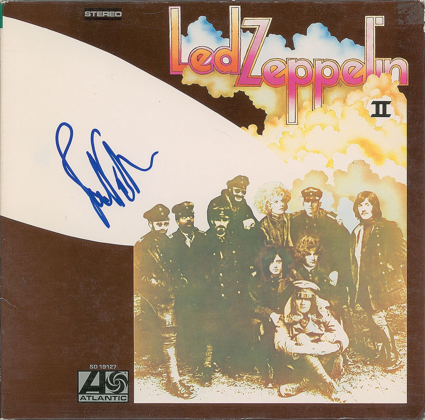 Led Zeppelin II album signed on the front cover in blue felt tip by John Paul Jones. In fine condition, with some old price sticker residue to the upper right corner. The record is not included. Originally obtained by in-person specialist Mike Wehrmann.