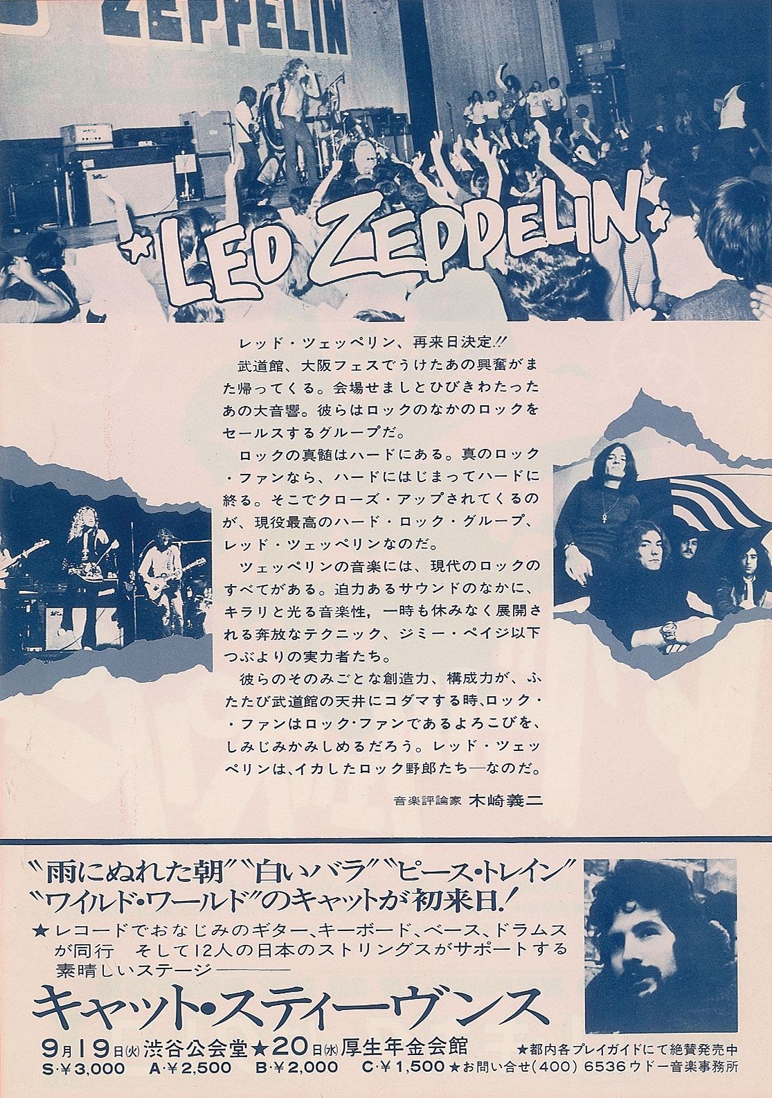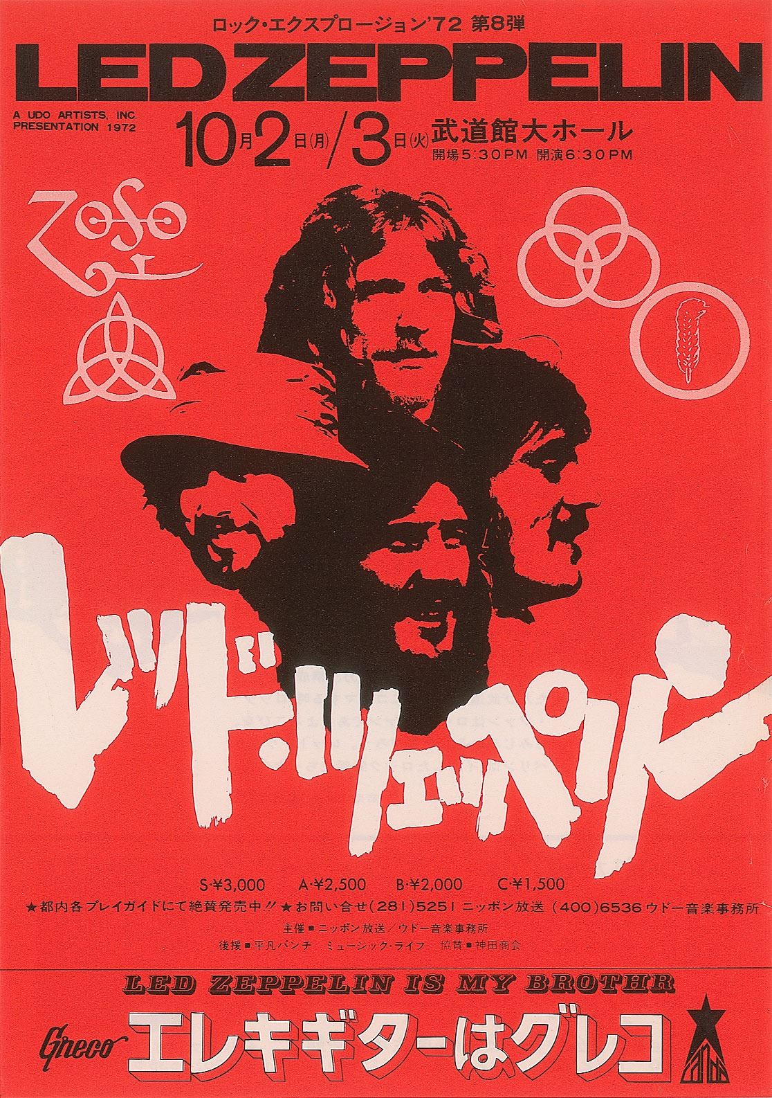 Attractive original bright red glossy 7 x 10.25 first printing Japanese handbill used to promote two Led Zeppelin concerts in Tokyo on October 2nd and 3rd, 1972, with Japanese language text and excellent band imagery and artwork to either side, with front showing a cluster of heads belonging to Robert Plant, Jimmy Page, John Bonham, and John Paul Jones and lower text reading: "Led Zeppelin Is My Brothr [sic]." In fine condition, with light handling along the extreme right edge.