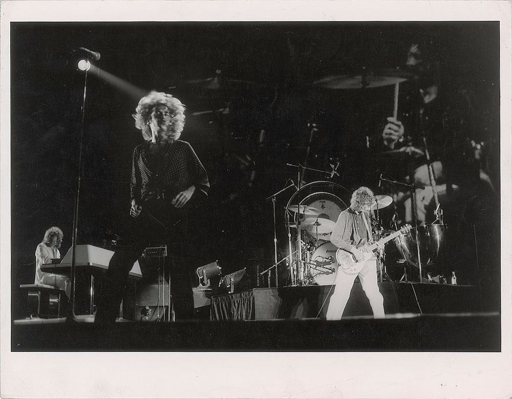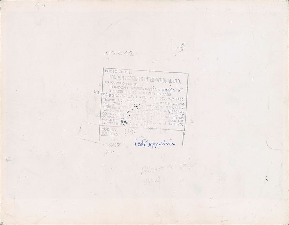Original glossy 12 x 9.25 silver gelatin photo of Led Zeppelin performing at Knebworth in 1979. Reverse bears a London Features International credit stamp. In very good condition, with moderate scattered creasing. From the Globe Photo archives.