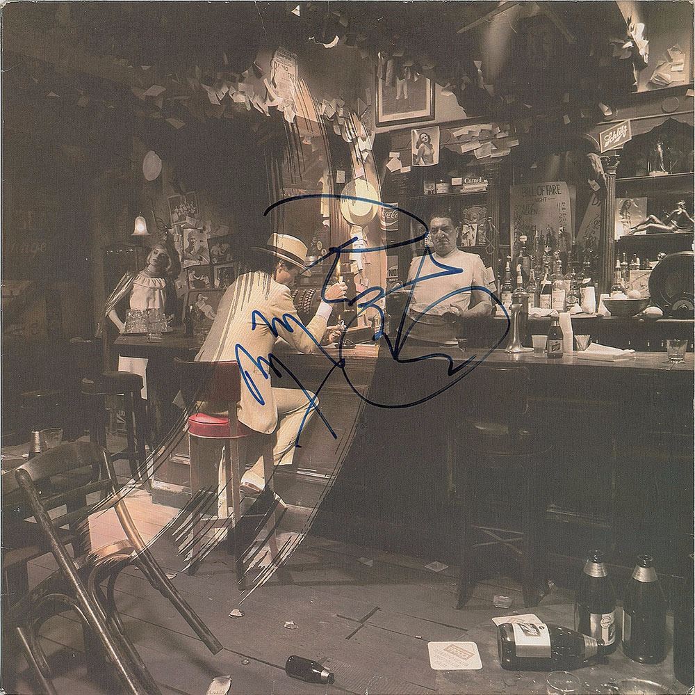 In Through the Out Door album signed on the front cover in blue felt tip by Robert Plant and Jimmy Page. In fine condition, with some corner wear. The record is not included. Accompanied by full letters of authenticity from REAL and PSA/DNA. In Through the Out Door was the last released Led Zeppelin record that featured new material; 1982’s Coda consisted of unused tracks from various sessions. According to Page, the band were planning for a more ‘hard-driving rock album’ for their next effort, but the death of drummer John Bonham the following year effectively ended the band. A particularly uncommon album signed by two rock legends.