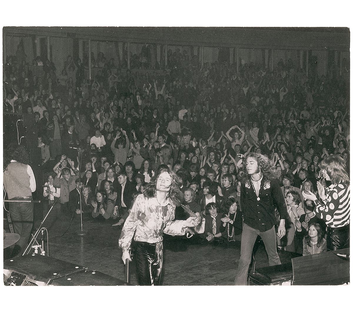 Impressive unsigned vintage semi-glossy 11.75 x 8.75 double-weight Robert Ellis photo of a young Led Zeppelin leaving the stage after a performance in a packed Royal Albert Hall on June 29, 1969. Reverse is affixed with a Robert Ellis copyright label, with a photography stamp underneath. In fine condition, with slight wear to edges and trivial creasing to left side.