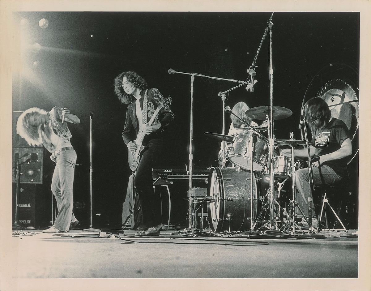 Original satin-finish 14 x 11 photo of Led Zeppelin in concert by Richard Creamer, showing the complete lineup of Jimmy Page, Robert Plant, John Bonham, and John Paul Jones. In fine condition. Provenance: Richard Creamer Estate.