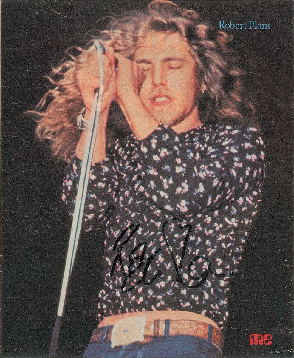 Two photos: a color 7.75 x 10.25 magazine photo of Jimmy Page during a performance, signed in black felt tip; and a color 10 x 12 magazine photo of Plant behind his microphone, signed in black felt tip. In overall very good to fine condition, with mounting remnants to reverse. Consignor notes that these vintage signatures were obtained in person in Vienna during the early to mid-1970s.