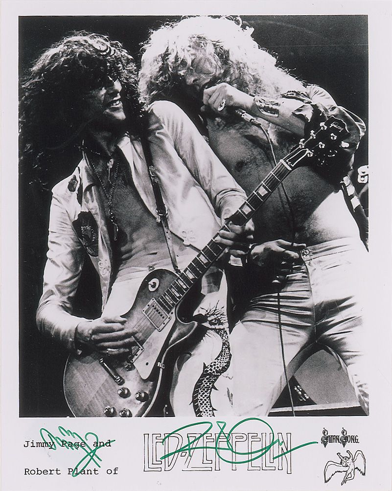 Glossy 8 x 10 photo of Plant and Page in concert, signed in the lower border in green felt tip by both. In fine condition.