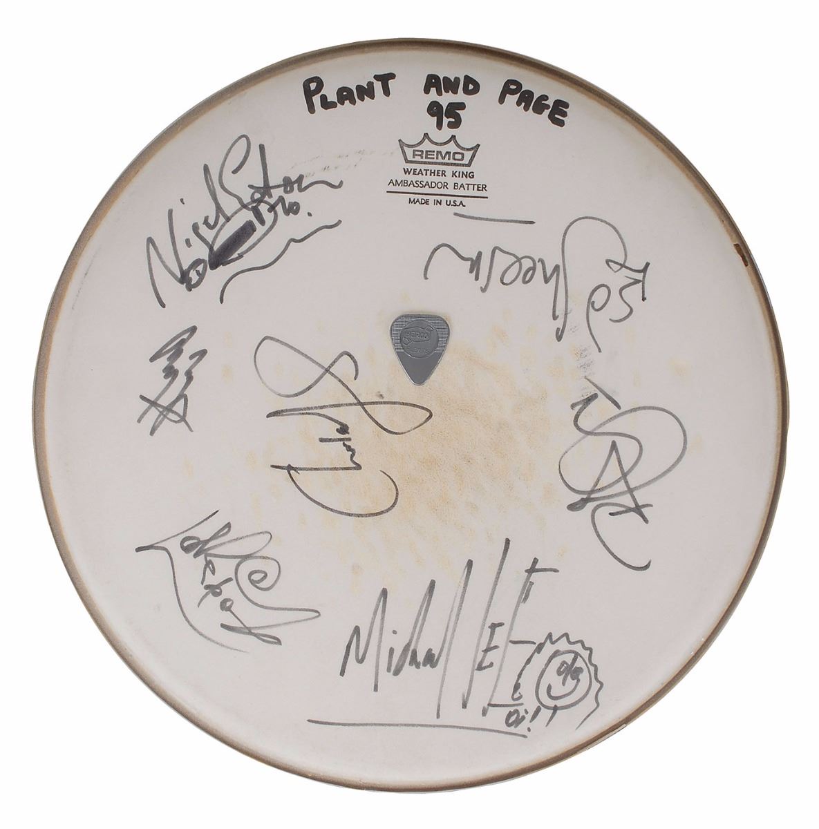 Off-white coated Remo Weather King drum head, 12.5? in diameter, signed in black felt tip by Robert Plant, Jimmy Page, and five members of their touring group, with a Jimmy Page Herco Flex 75 guitar pick affixed to center. In fine condition. Notation along upper rim indicates that the signatures were obtained during their 1995 tour.