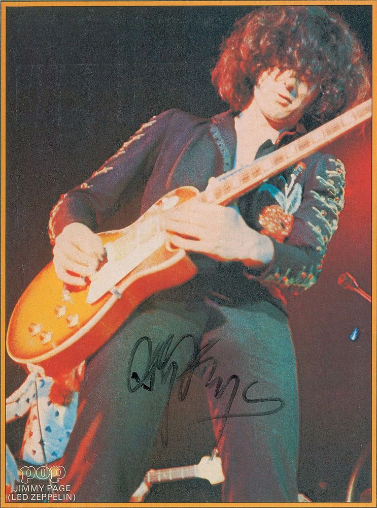 Two photos: a color 7.75 x 10.25 magazine photo of Jimmy Page during a performance, signed in black felt tip; and a color 10 x 12 magazine photo of Plant behind his microphone, signed in black felt tip. In overall very good to fine condition, with mounting remnants to reverse. Consignor notes that these vintage signatures were obtained in person in Vienna during the early to mid-1970s.