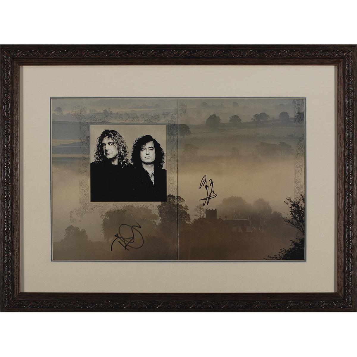 Page and Plant tour program, 9.25 x 12, signed in black felt tip across a two-page gatefold measuring 18.5 x 12, by Robert Plant and Jimmy Page. Double matted and framed to an overall size of 26.5 x 20. In fine condition. Oversized.