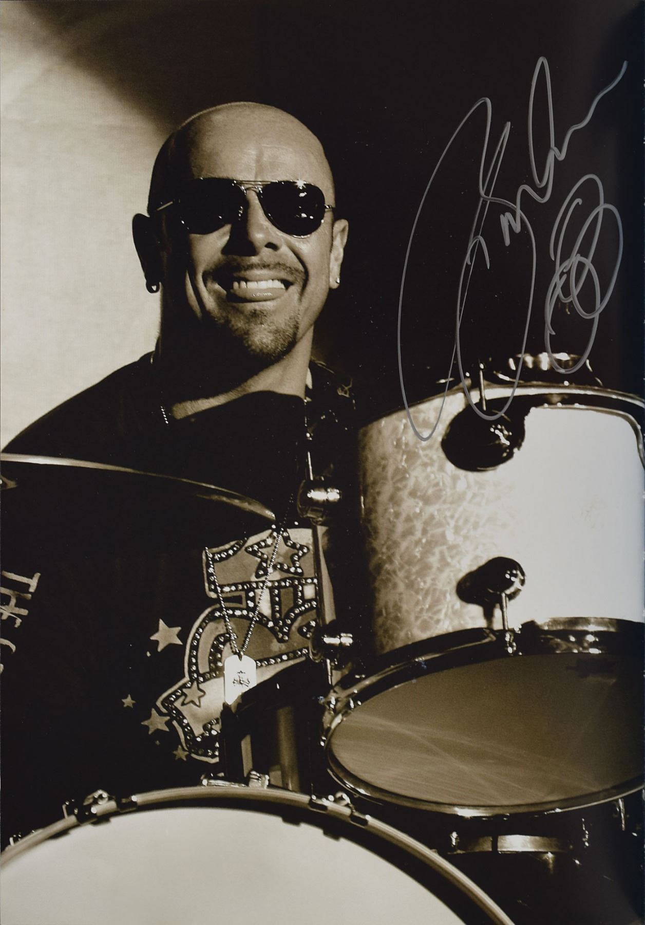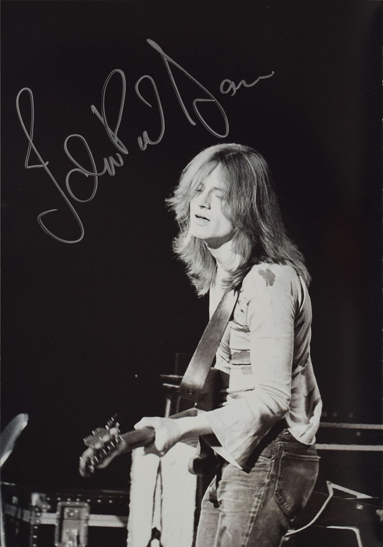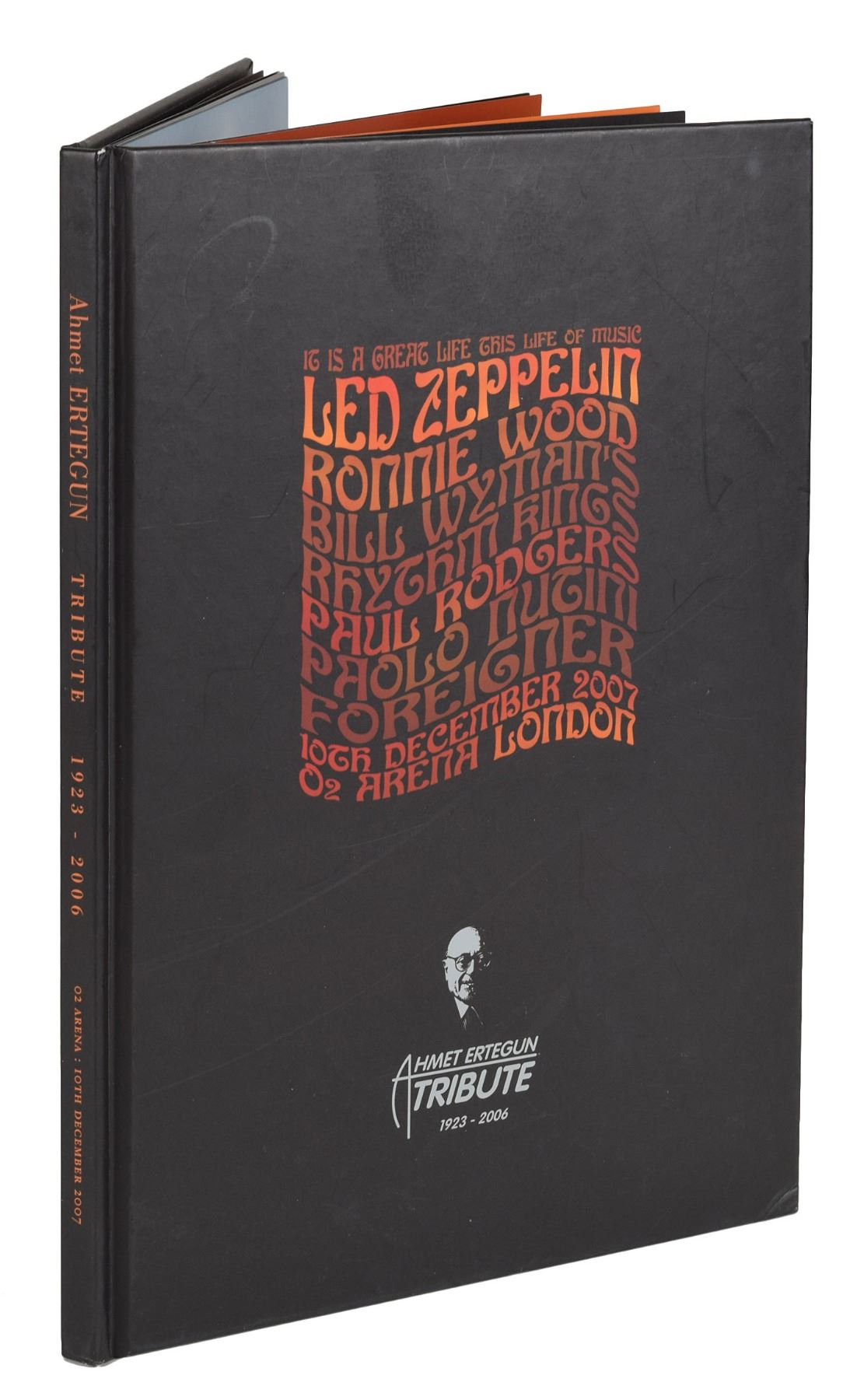 Rare hardcover program for the Ahmet Ertegun Tribute Concert held at the O2 Arena in London on December 10, 2007, forty-eight pages, 8.5 x 12, signed inside on their respective pages in silver ink by Robert Plant, Jimmy Page, John Paul Jones, and Jason Bonham. In fine condition. Accompanied by a letter of provenance from the original recipient, in full: “In 2007 I paid a world record £83,000 for 2 tickets to Led Zeppelin’s Reunion Concert. The auction was part of BBC Radio 2’s Children in Need Appeal. As part of the package I also got to meet the band the day before the concert at their final rehearsal, where I was given the signed concert programme.” Also accompanied by a color image of the auction winner posing with Led Zeppelin, and a copy of the BBC-organized ‘Things Money Can’t Buy’ auction ‘Led Zeppelin Live’ lot from November 15, 2007, which details the full auction winner experience.