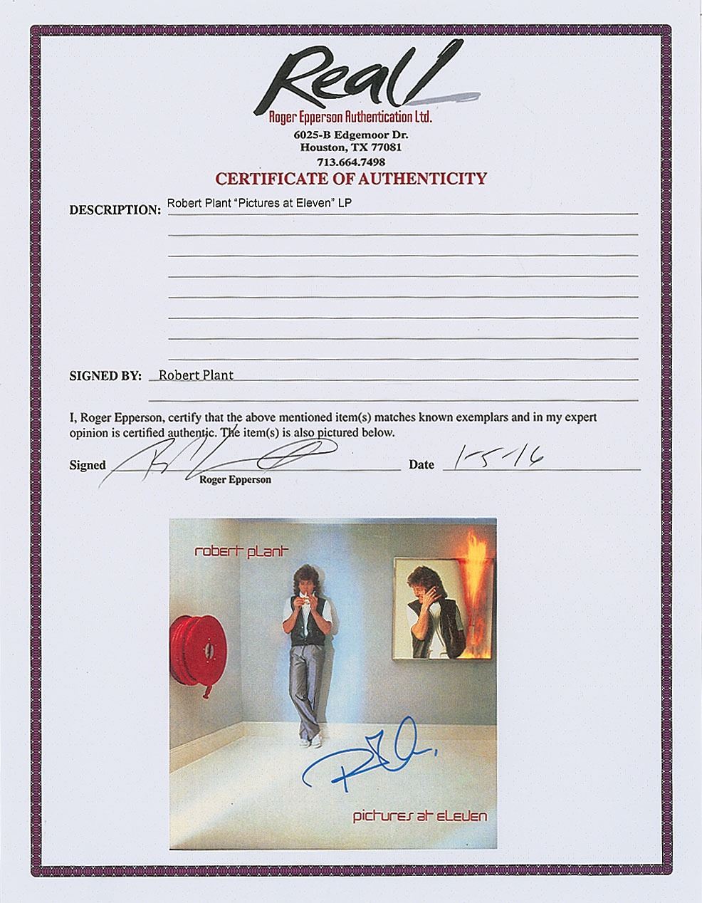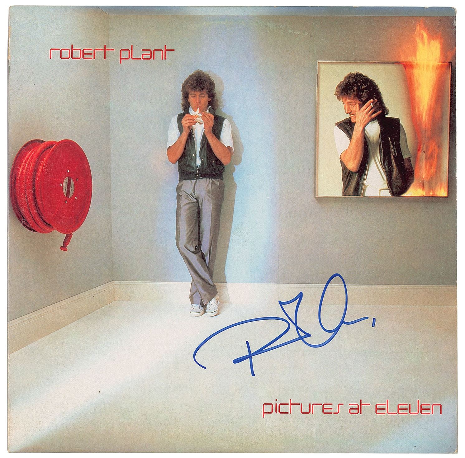 Pictures at Eleven album by Robert Plant, signed on the front cover in blue felt tip. In fine condition, with some old price sticker residue on the back cover. The record is included. Accompanied by a full letter of authenticity from REAL.