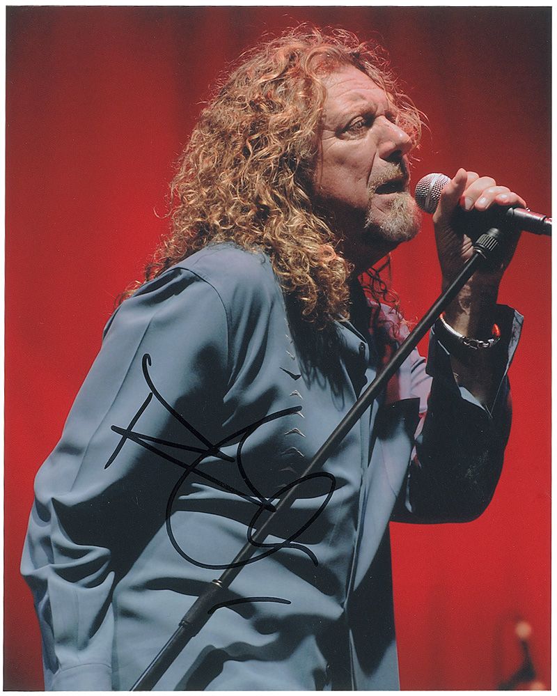 Color satin-finish 8 x 10 photo of Plant on stage, signed vertically in black felt tip. In fine condition.
