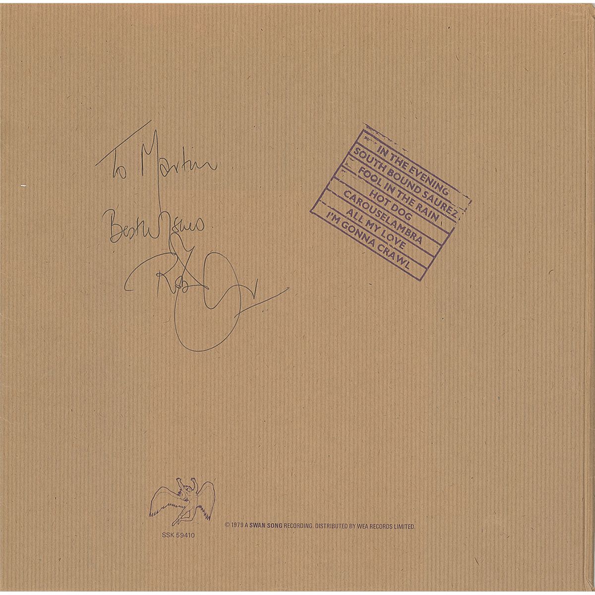 In Through the Out Door album signed and inscribed on the front cover in black ballpoint, “To Martin, Best wishes, Robert Plant.” In fine condition. The record is included. Accompanied by a letter of provenance from a Monmouth police officer who originally obtained three albums from Plant for charity raffles while Led Zeppelin was recording at Rockfield Studios. Accompanied by a certificate of authenticity from Tracks.