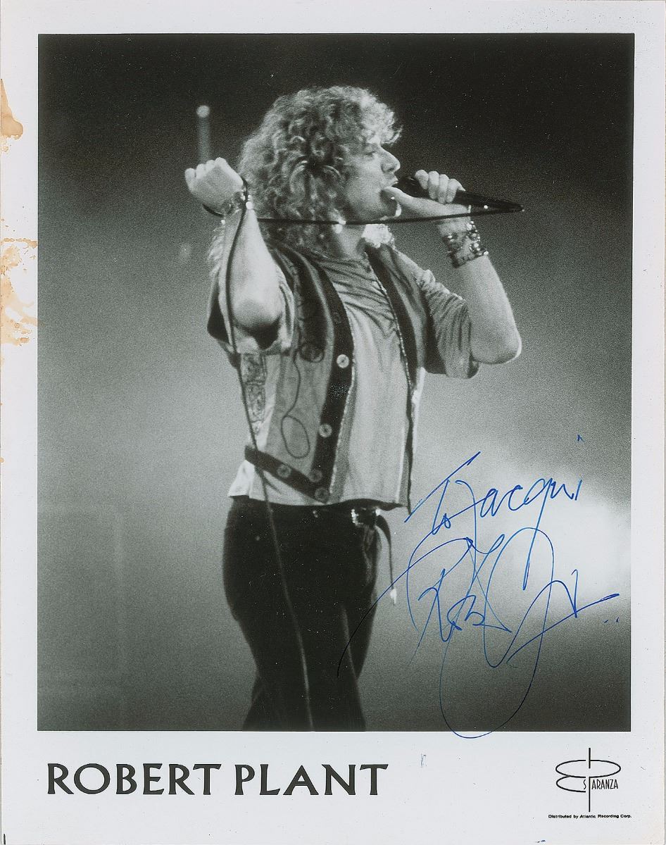 Glossy 8 x 10 Esparanza publicity photo of Plant performing on stage, signed and inscribed in blue ink, “To Jacqui, Robert Plant.” Mounted to a same-size cardstock sheet. In fine condition, with stains to left edge.