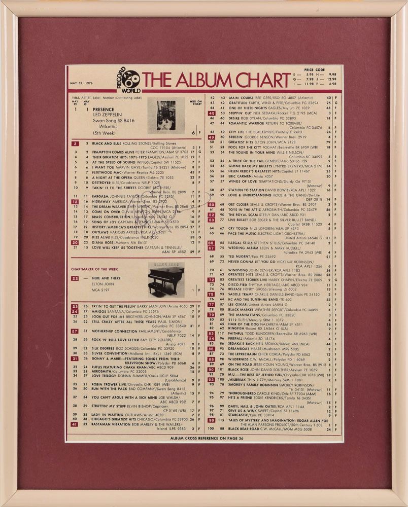 Record World top 100 album chart from May 22, 1976, one page, 9.25 x 12.5, signed in pencil by Robert Plant. The chart's top spot belongs to Presence, the seventh full-length record from Led Zeppelin. Matted and framed to an overall size of 13.5 x 16.75. In fine condition. Accompanied by a full letter of authenticity from PSA/DNA.