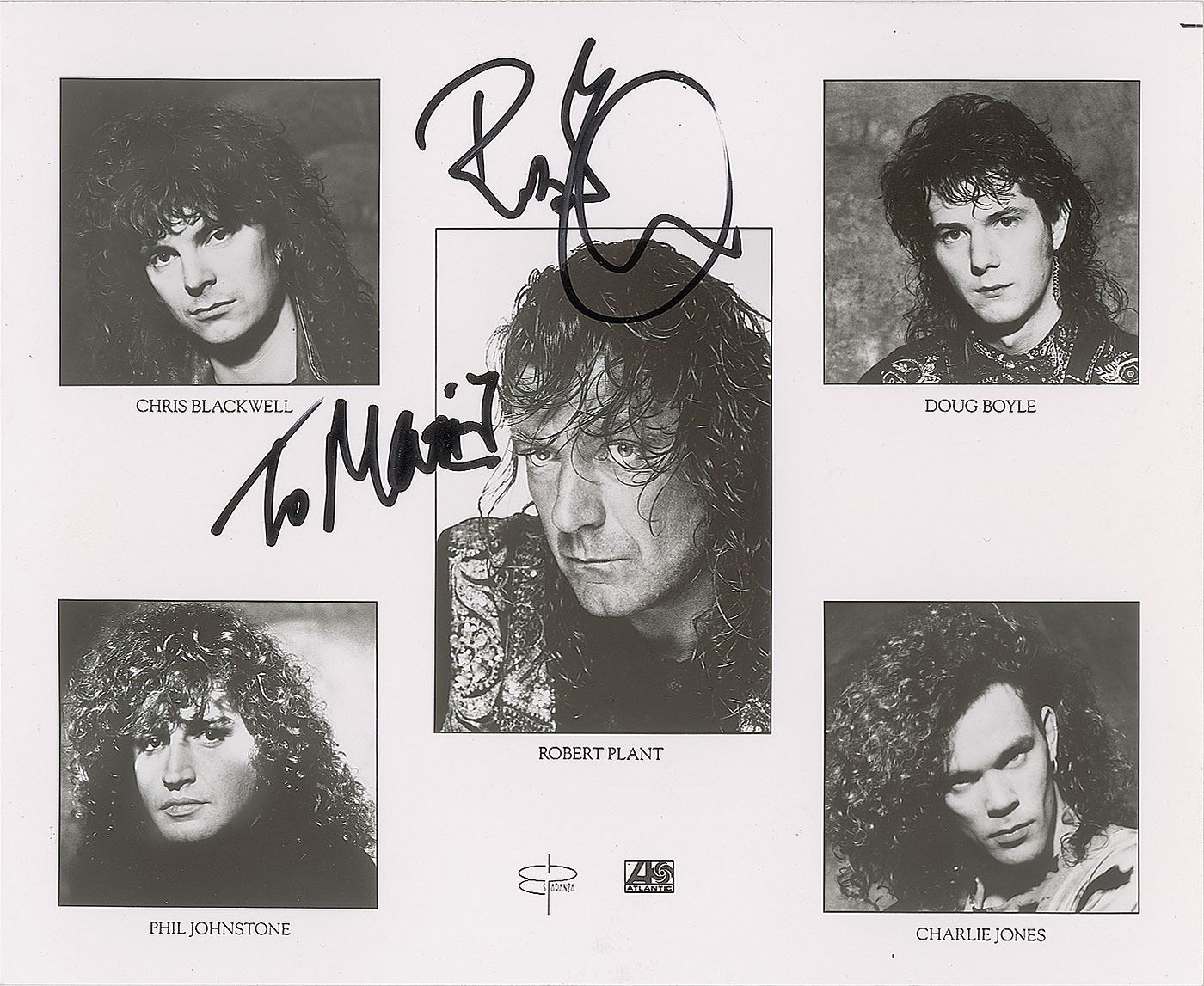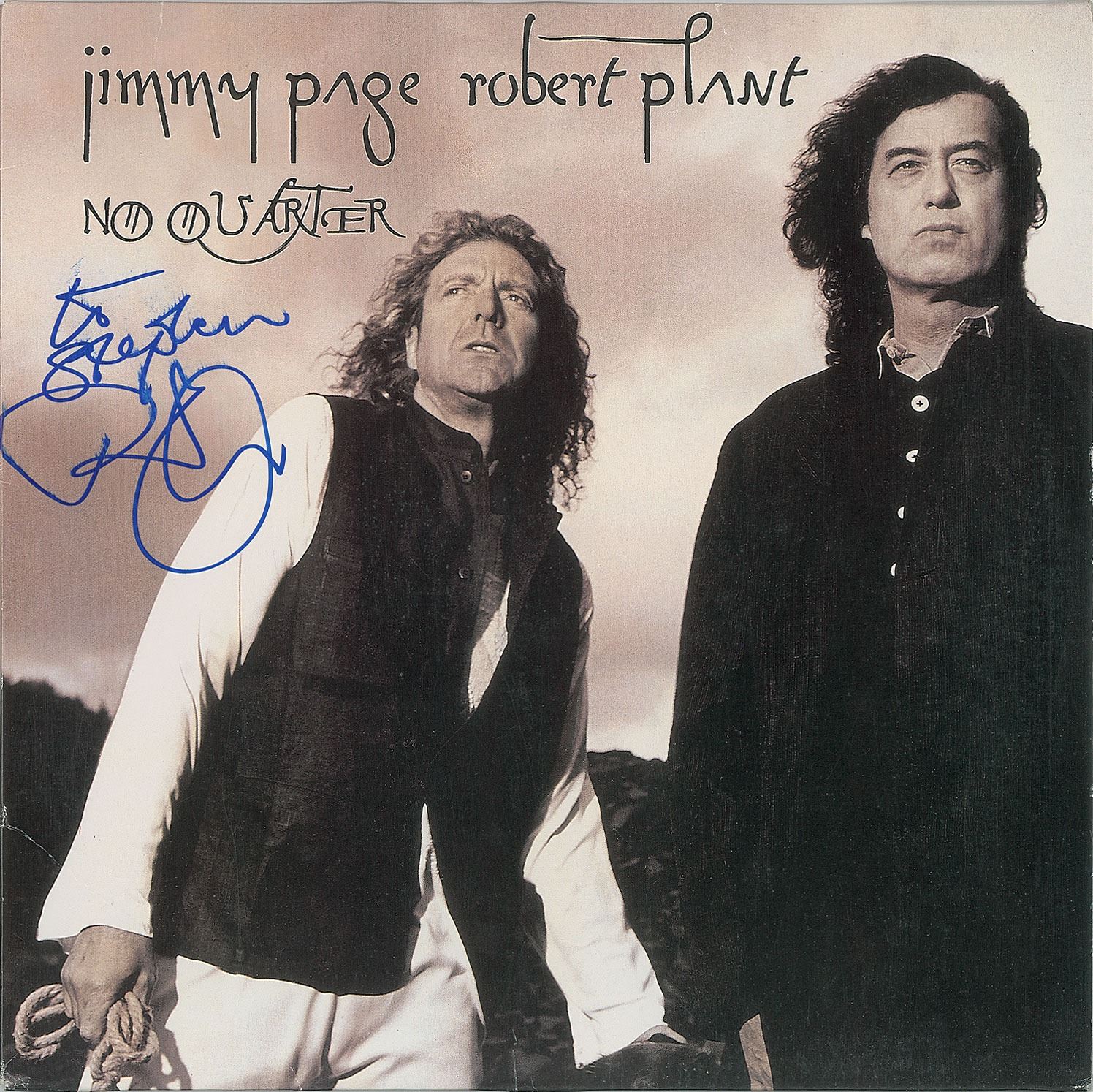 Two items: a satin-finish 10 x 8 Atlantic Records for Robert Plant and his band, signed and inscribed in black felt tip by Plant; and a No Quarter: Jimmy Page and Robert Plant Unledded album, signed and inscribed on the front cover in blue felt tip by Plant. In overall fine condition, with light brushing to the ink on the album. The record is not included.