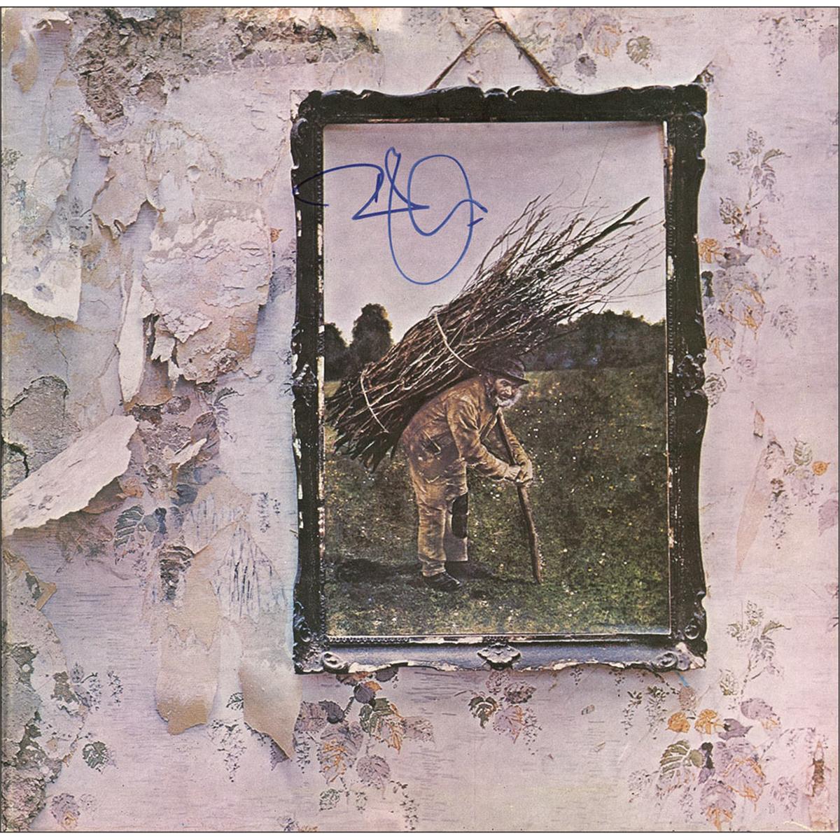 Led Zeppelin IV album signed on the front cover in blue felt tip. In fine condition, with a few scattered light bends and creases. The record is not included.