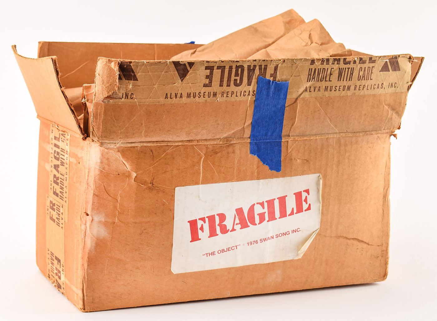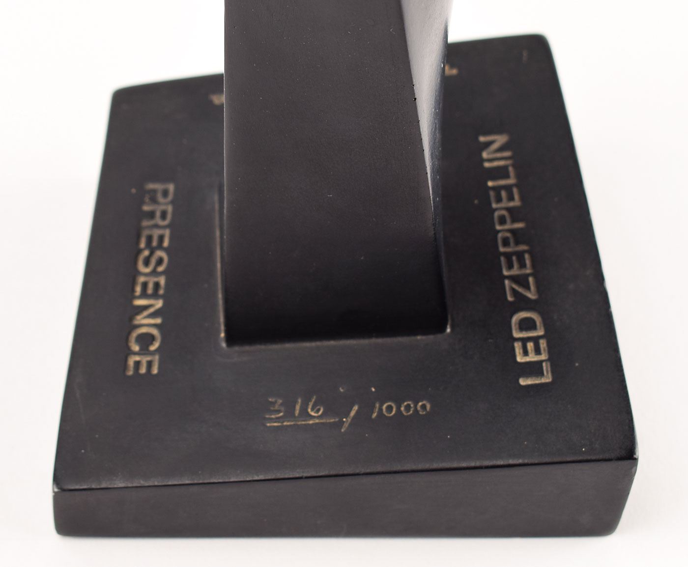 Limited edition promotional statuette of 'The Object,' a black obelisk-shaped object that appears throughout the artwork packaging for Led Zeppelin's 1976 album Presence. The 'Object' stands 12? in height, with base engraved on each side: "Led Zeppelin, Presence, 316/1000, 'The Object' 1976 Swan Song Inc." Bottom of base bears an Alva Studios label. In fine condition. Accompanied by the original shipping box from Swan Song.