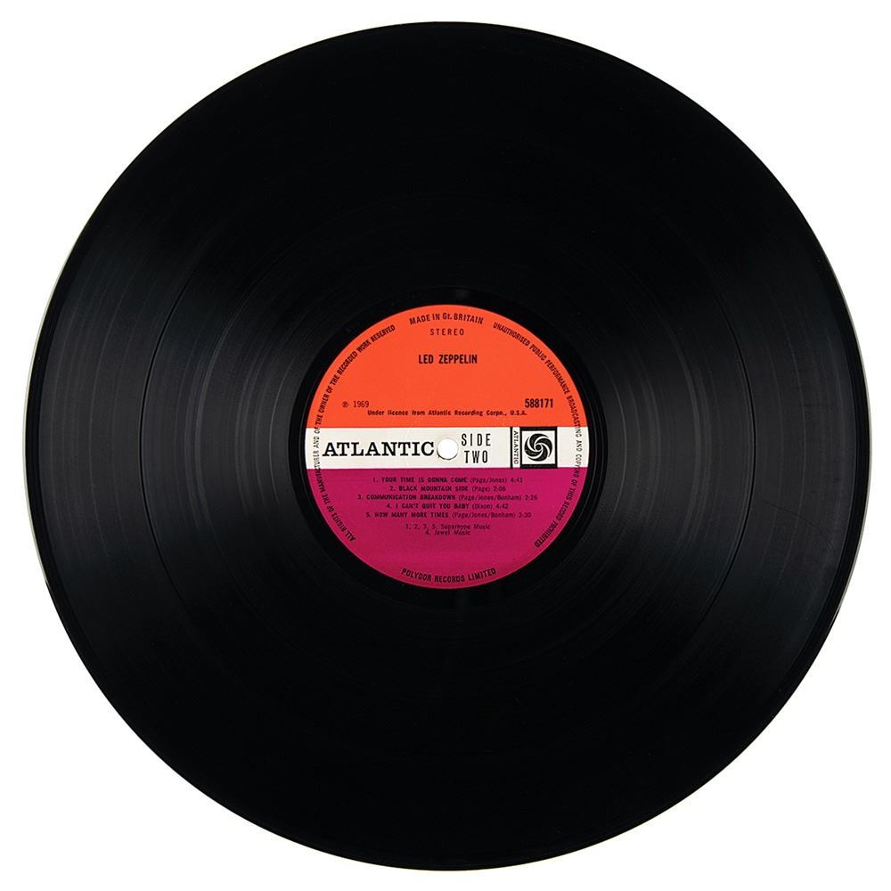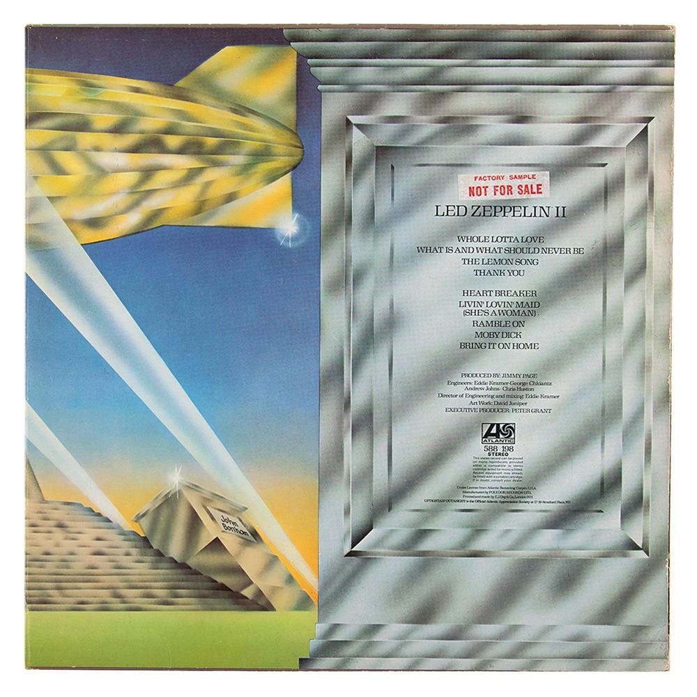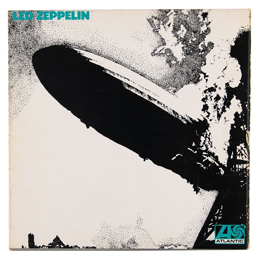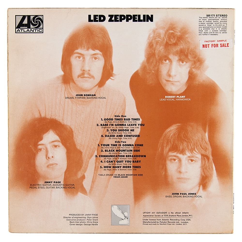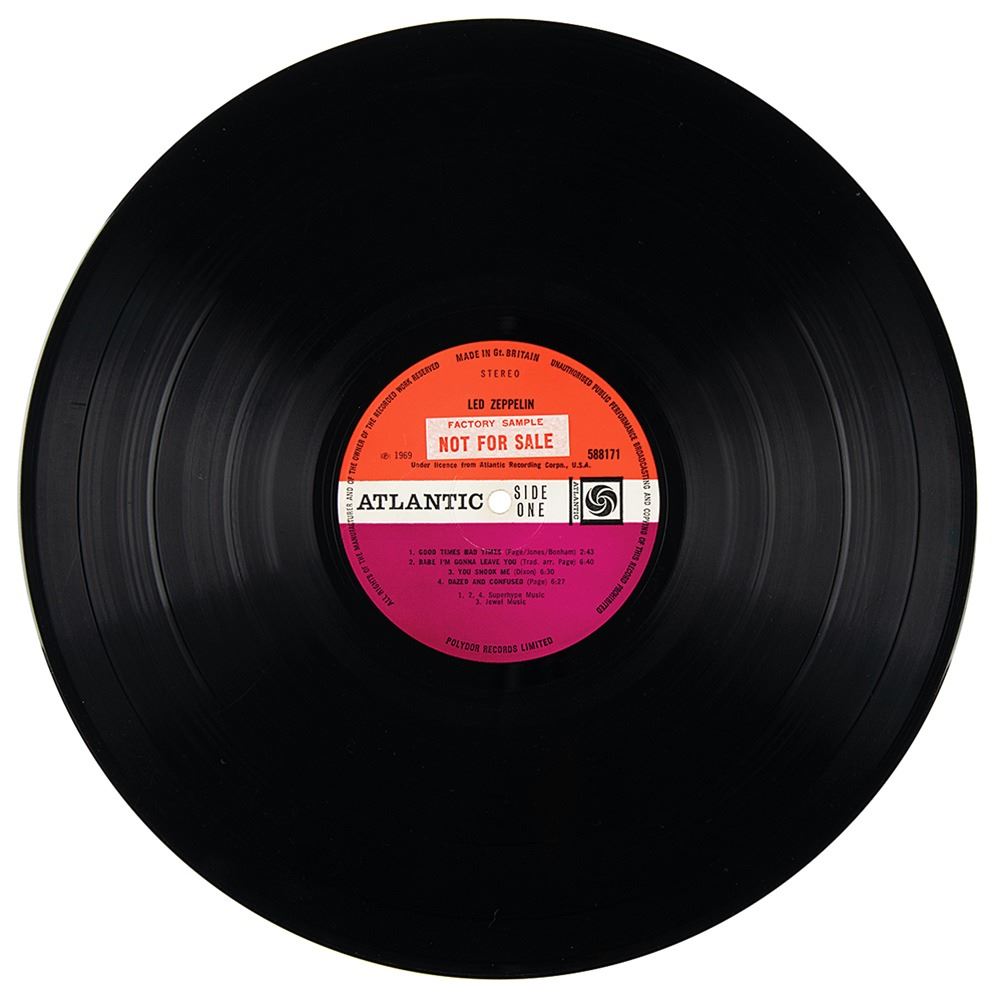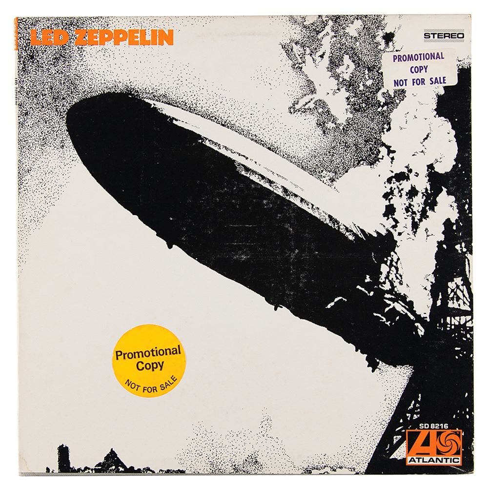 Ultra rare UK promotional first pressing of Led Zeppelin’s self-titled debut album (Atlantic, 588171, Stereo), with turquoise blue lettering to the front cover and “Factory Sample, Not for Sale” labels affixed to the back cover and to the side one label. Matrix and runout numbers to both sides read (in part): “588171 A//1 1” and “588171 B//1 1.” In fine condition, with scattered light creasing to covers. The record is included. This elusive promotional release was quickly pulled and replaced with the orange-lettered cover, which the band considered more provocative and suitable for a loud rock album. One of only two first pressing promo examples that are known to exist, this record is a true rock rarity and an immensely hard-to-find Led Zeppelin collectable, one which is virtually unobtainable and rarely offered for sale or auction.