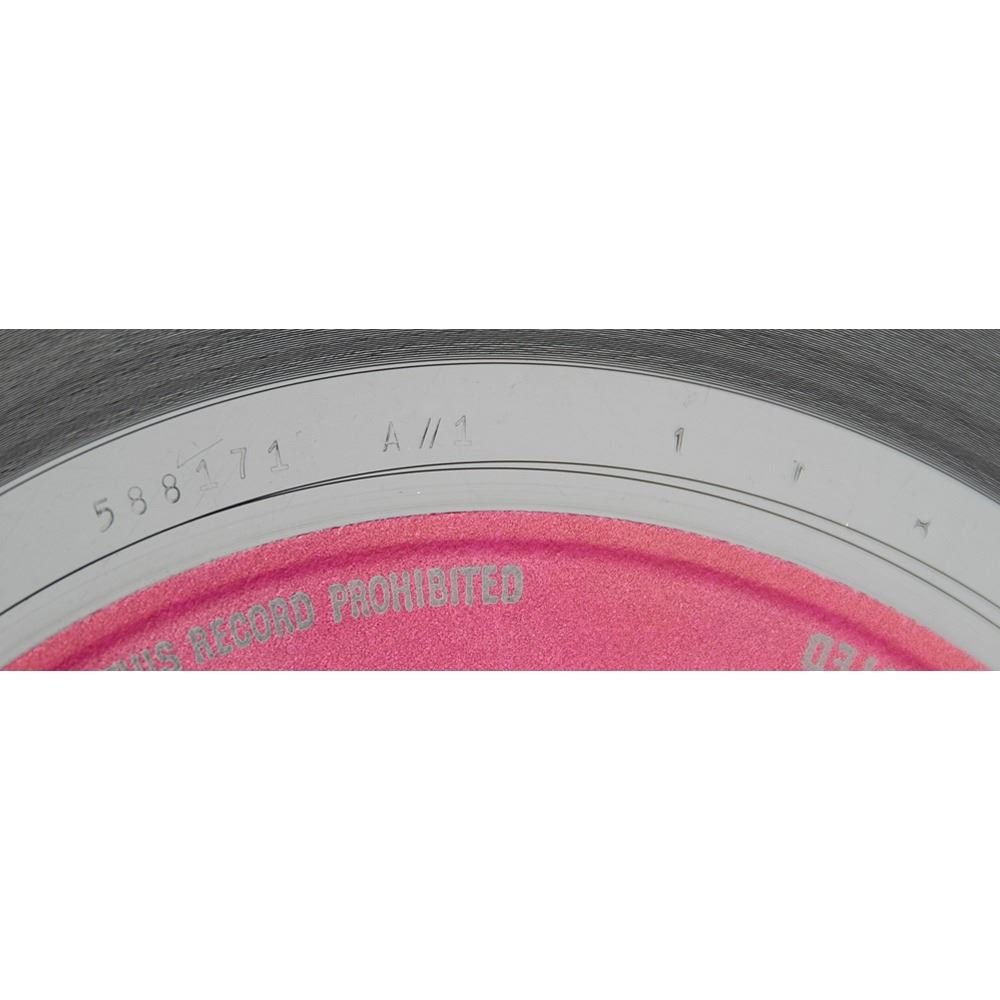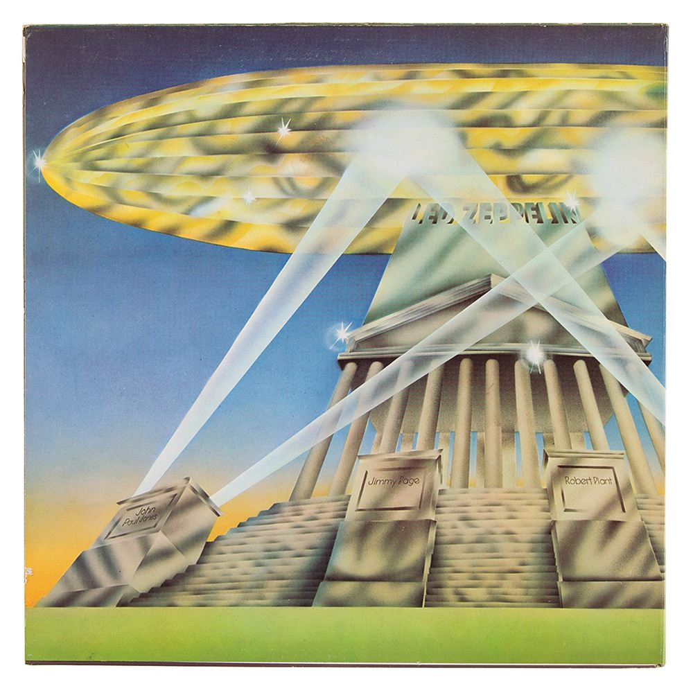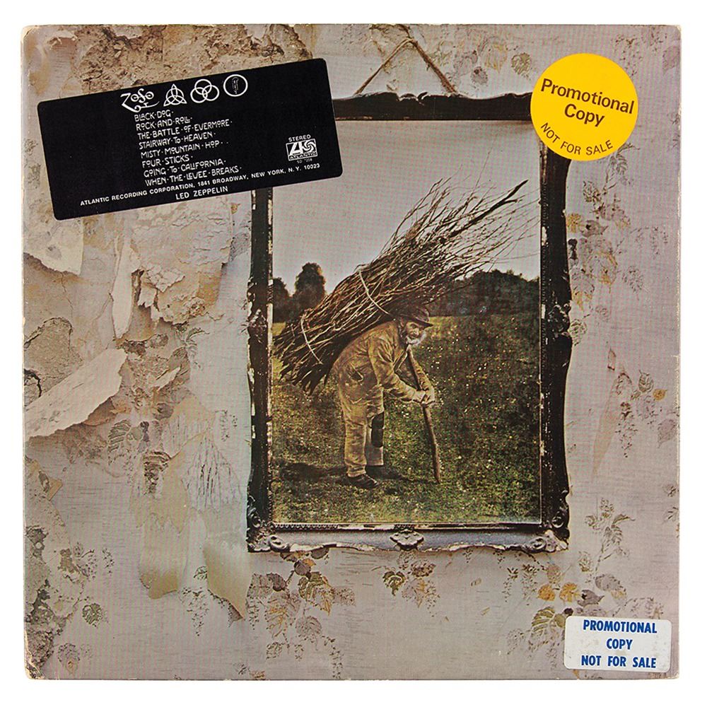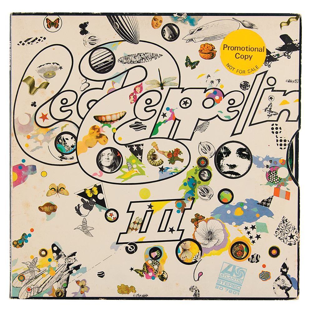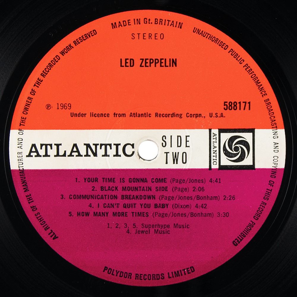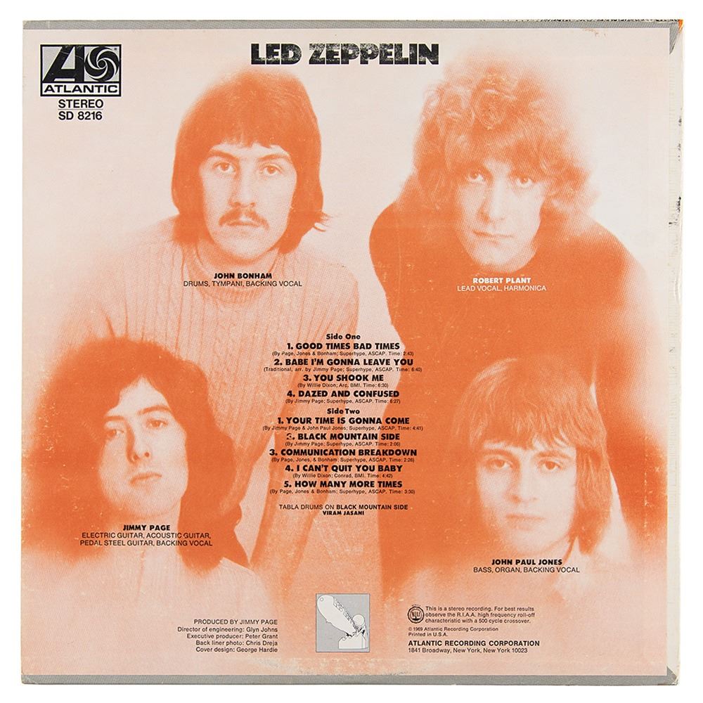 Ultra rare UK promotional first pressing of Led Zeppelin’s self-titled debut album (Atlantic, 588171, Stereo), with turquoise blue lettering to the front cover and “Factory Sample, Not for Sale” labels affixed to the back cover and to the side one label. Matrix and runout numbers to both sides read (in part): “588171 A//1 1” and “588171 B//1 1.” In fine condition, with scattered light creasing to covers. The record is included. This elusive promotional release was quickly pulled and replaced with the orange-lettered cover, which the band considered more provocative and suitable for a loud rock album. One of only two first pressing promo examples that are known to exist, this record is a true rock rarity and an immensely hard-to-find Led Zeppelin collectable, one which is virtually unobtainable and rarely offered for sale or auction.