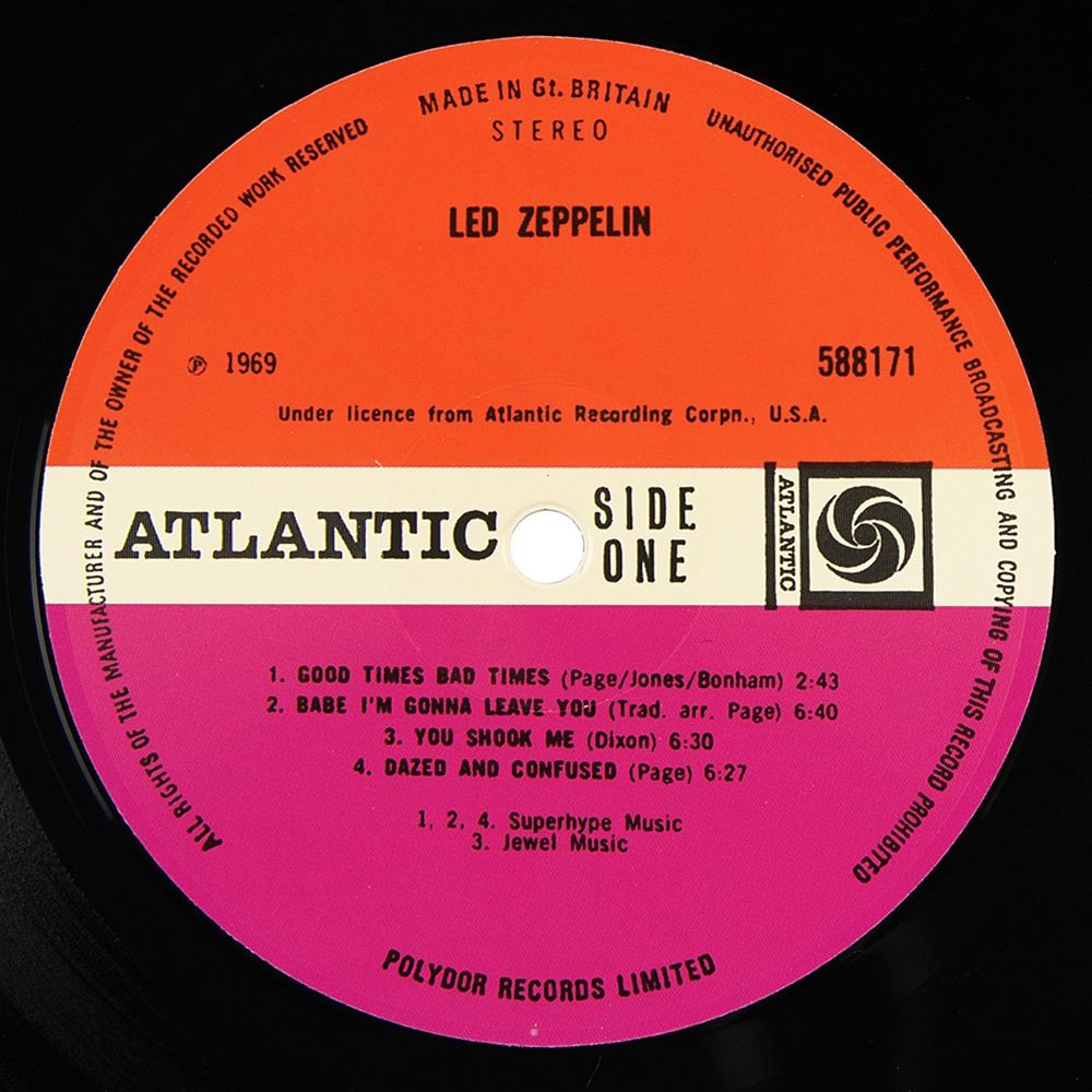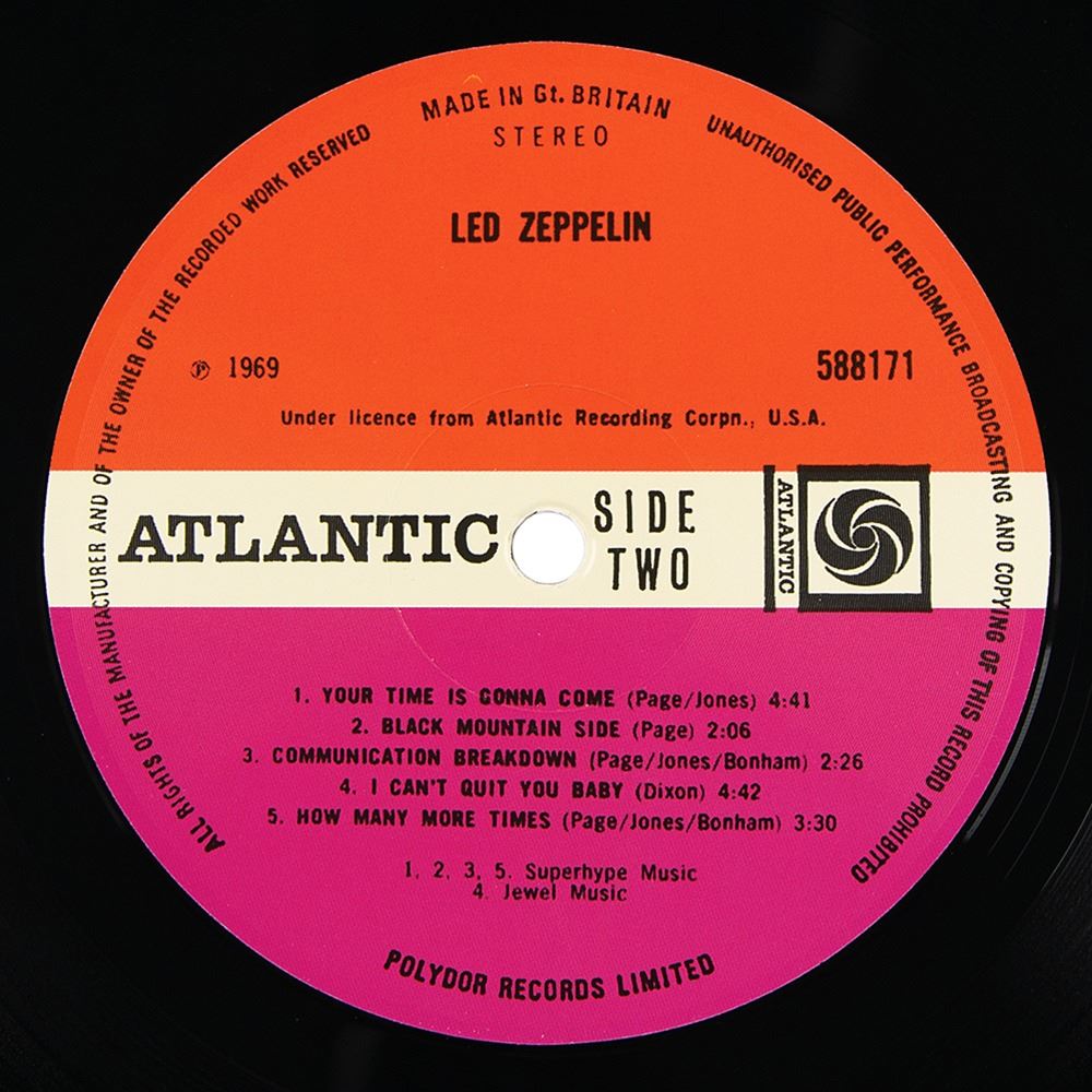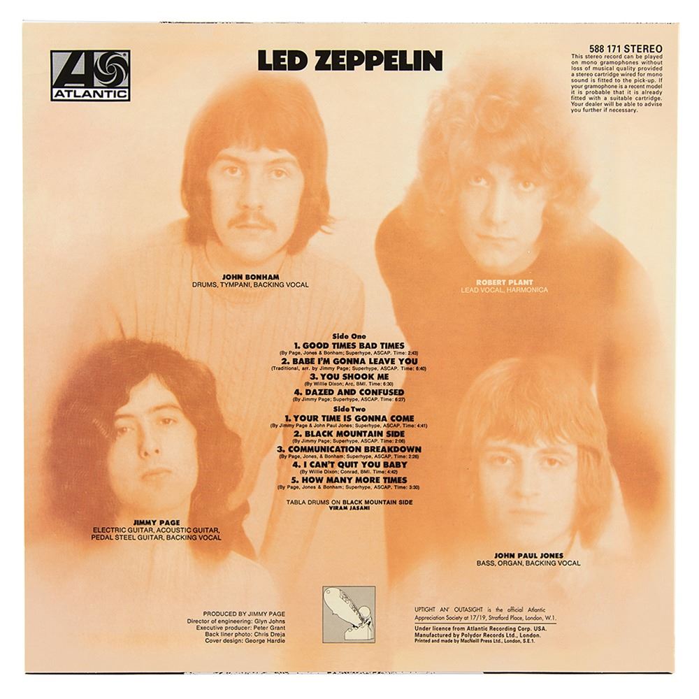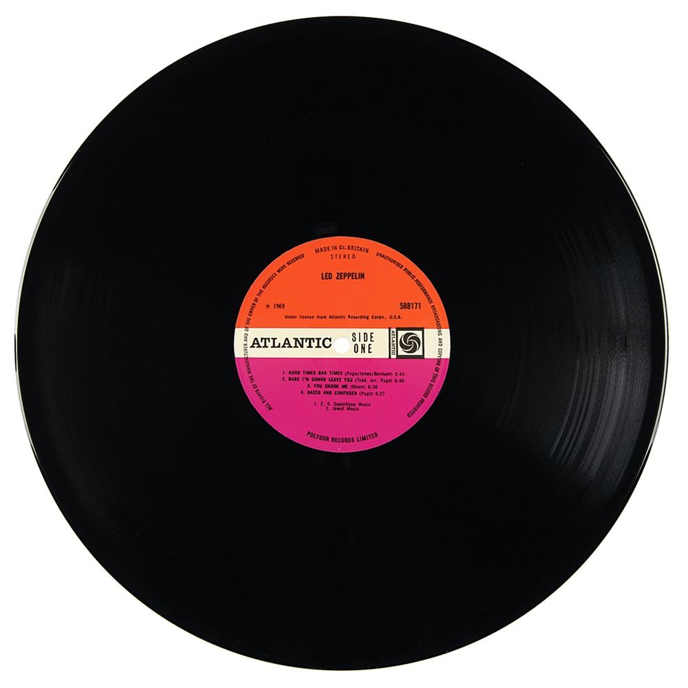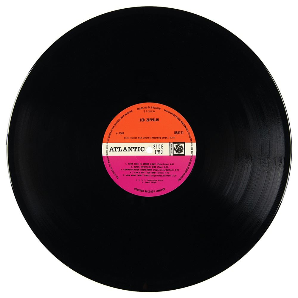 Never-released U.S. 2019 reissue sample album of Led Zeppelin’s self-titled debut studio album, (Atlantic Records, 588171, Stereo), which features turquoise blue lettering on the front cover and the spine marked as “Led Zeppelin, Atlantic 588 171”; spines of reproductions are left blank. The black vinyl features no matrix or runout numbers to the dead wax; some reproductions are pressed on different colored vinyl and list "LZ-A" and "LZ-B" on the corresponding sides of the dead wax, rather than the catalog number. In very fine condition. The record is included. An extremely rare Led Zeppelin reissue that never made it to the public market—only a few copies are known to exist.
