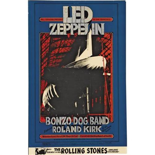<B>Led Zeppelin Winterland Concert Poster BG-199 (Bill Graham, 1969).</B></I> Two heavy-weight acts from Great Britain fill the bill on this attractive Bill Graham Presents poster, designed by Randy Tuten. Headlining act Led Zeppelin were at the start of their career in 1969, with Jimmy Page fresh from his stint in the Yardbirds. And the opening act, Bonzo Dog Band, was much-loved in their native England (anyone remember their 1968 UK television series, "Do Not Adjust Your Set", where they were listed as "Bonzo Dog Doo-Dah Band"?). This first-print poster measures approximately 13.75" x 21.25", and is in VG+ condition. Early Zep posters are always popular, so get those bids in early!<BR><BR><b>Shipping:</b> Flat Material, Large (<a target="_blank" href="http://www.heritageauctions.com/common/shipping.php">view shipping information</a>)